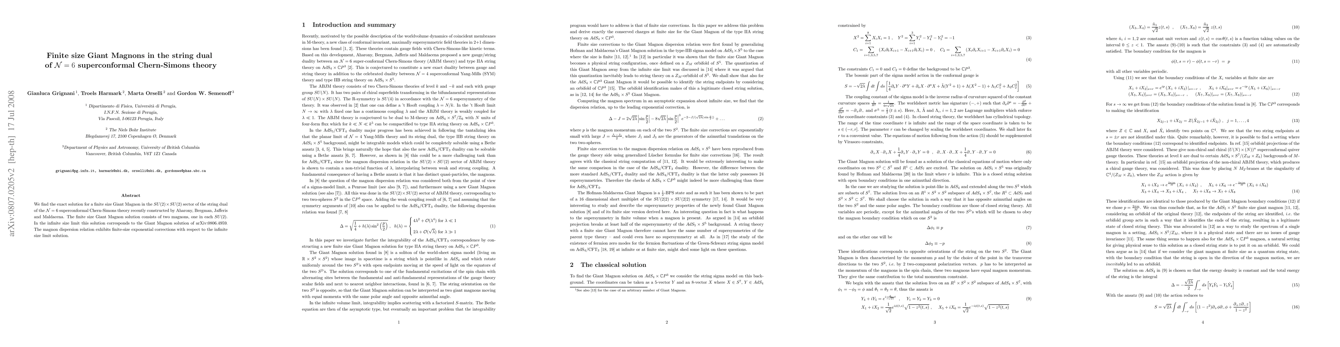 We find the exact solution for a finite size Giant Magnon in the $SU(2)\times SU(2)$ sector of the string dual of the $\mathcal{N}=6$ superconformal Chern-Simons theory recently constructed by Aharony, Bergman, Jafferis and Maldacena. The finite size Giant Magnon solution consists of two magnons, one in each $SU(2)$. In the infinite size limit this solution corresponds to the Giant Magnon solution of arXiv:0806.4959. The magnon dispersion relation exhibits finite-size exponential corrections with respect to the infinite size limit solution.