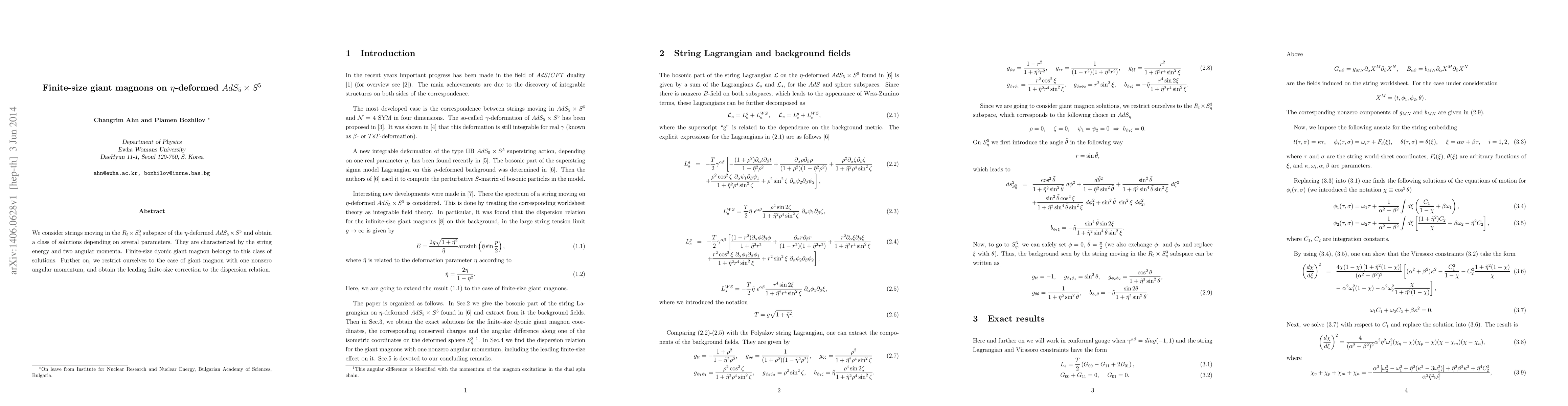 Summary: The study investigates strings in the \eta-deformed AdS_5 x S^5, focusing on finite-size giant magnons with specific energy and angular momentum dependencies. The paper derives leading finite-size corrections to the dispersion relation for a particular case of giant magnon with one nonzero angular momentum.