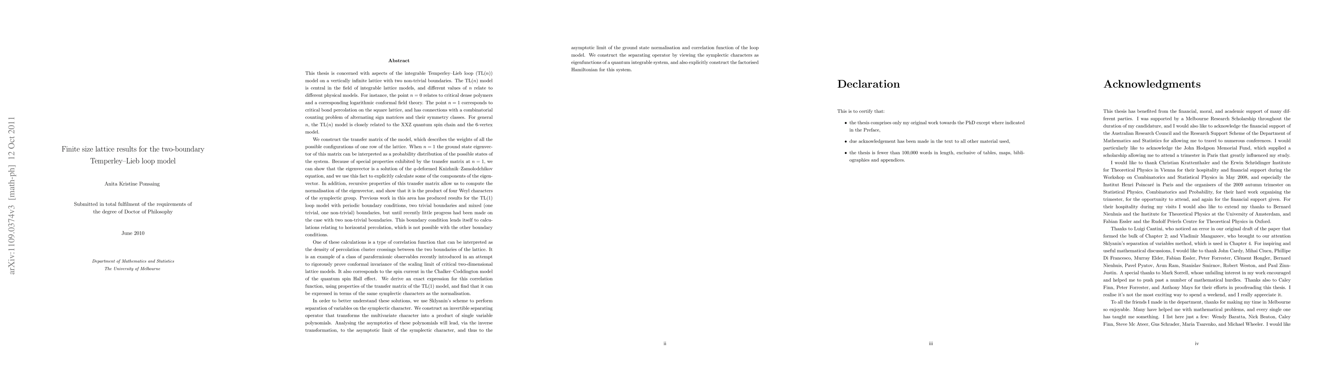 This thesis is concerned with aspects of the integrable Temperley--Lieb loop (TL($n$)) model on a vertically infinite lattice with two non-trivial boundaries. When $n=1$ the ground state eigenvector of the transfer matrix of this model can be interpreted as a probability distribution of the possible states of the system. Because of special properties the transfer matrix has at $n=1$, we can show that the eigenvector is a solution of the q-deformed Knizhnik--Zamolodchikov equation, and we use this fact to explicitly calculate some of the components of the eigenvector. In addition, recursive properties of the transfer matrix allow us to compute the normalisation of the eigenvector, and show that it is the product of four Weyl characters of the symplectic group. The boundary condition of this model lends itself to calculations relating to horizontal percolation. One of these calculations is a type of correlation function that can be interpreted as the density of percolation cluster crossings between the two boundaries of the lattice. It is an example of a class of parafermionic observables recently introduced in an attempt to rigorously prove conformal invariance of the scaling limit of critical two-dimensional lattice models. We derive an exact expression for this correlation function, and find that it can be expressed in terms of the same symplectic characters as the normalisation. In order to better understand these solutions, we use Sklyanin's scheme to perform separation of variables on the symplectic character, transforming the multivariate character into a product of single variable polynomials. Analysing the asymptotics of these polynomials will lead, via the inverse transformation, to the asymptotic limit of the symplectic character, and thus to the asymptotic limit of the ground state normalisation and correlation function of the loop model.