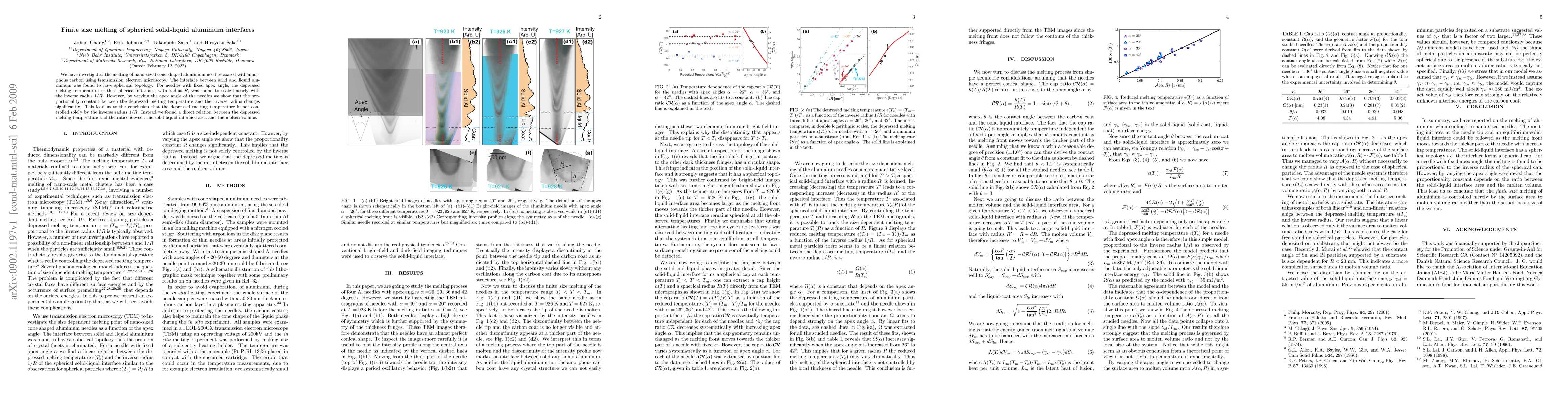We have investigated the melting of nano-sized cone shaped aluminium needles coated with amorphous carbon using transmission electron microscopy. The interface between solid and liquid aluminium was found to have spherical topology. For needles with fixed apex angle, the depressed melting temperature of this spherical interface, with radius $R$, was found to scale linearly with the inverse radius $1/R$. However, by varying the apex angle of the needles we show that the proportionality constant between the depressed melting temperature and the inverse radius changes significantly. This lead us to the conclusion that the depressed melting temperature is not controlled solely by the inverse radius $1/R$. Instead we found a direct relation between the depressed melting temperature and the ratio between the solid-liquid interface area and the molten volume.