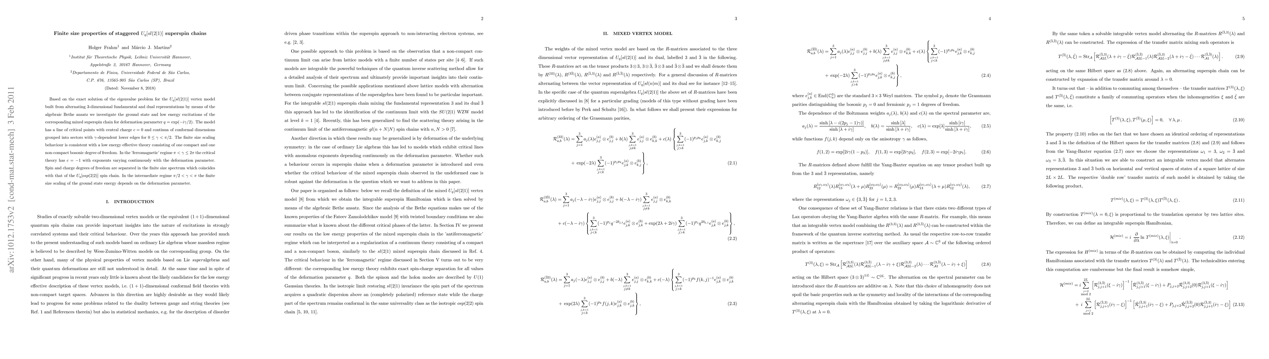 This paper investigates the finite size properties of staggered $U_q[sl(2|1)]$ superspin chains using the algebraic Bethe ansatz. It finds that the model has critical points with $c=0$ and varying conformal dimensions, while the finite size scaling behavior aligns with an effective theory of separated spin and charge degrees of freedom.