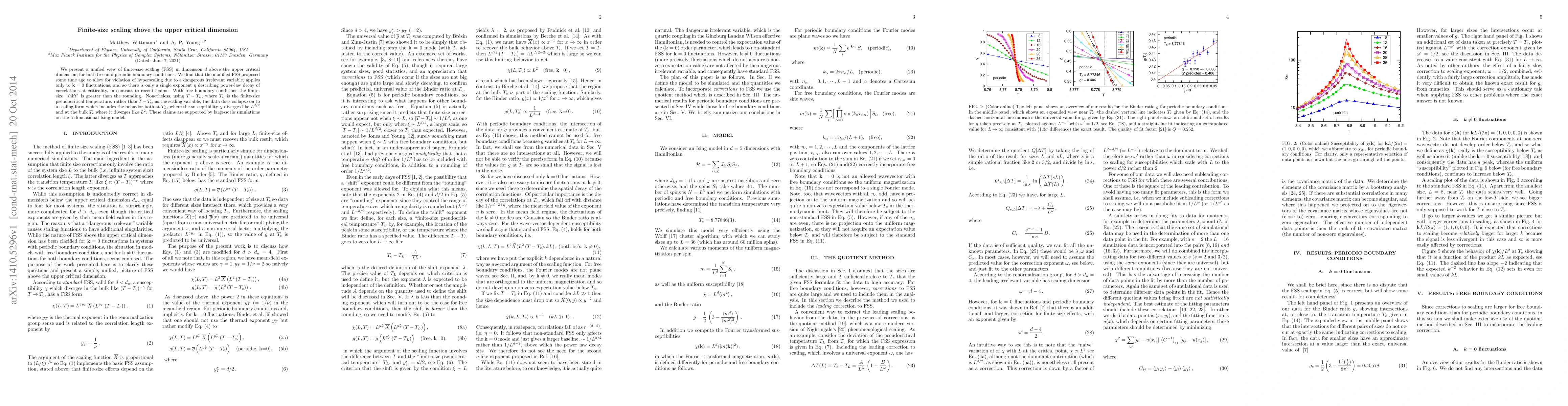 We present a unified view of finite-size scaling (FSS) in dimension d above the upper critical dimension, for both free and periodic boundary conditions. We find that the modified FSS proposed some time ago to allow for violation of hyperscaling due to a dangerous irrelevant variable, applies only to k=0 fluctuations, and so there is only a single exponent eta describing power-law decay of correlations at criticality, in contrast to recent claims. With free boundary conditions the finite-size "shift" is greater than the rounding. Nonetheless, using T-T_L, where T_L is the finite-size pseudocritical temperature, rather than T-T_c, as the scaling variable, the data does collapse on to a scaling form which includes the behavior both at T_L, where the susceptibility chi diverges like L^{d/2} and at the bulk T_c where it diverges like L^2. These claims are supported by large-scale simulations on the 5-dimensional Ising model.