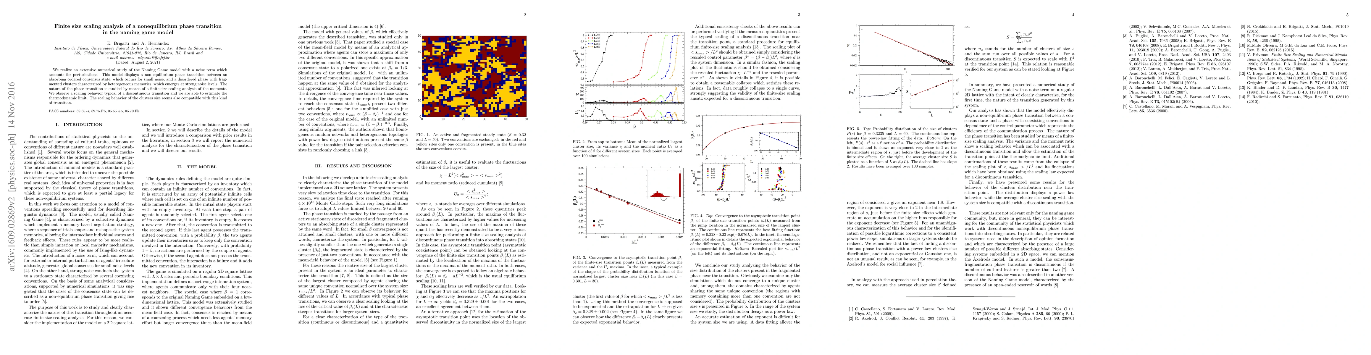 This paper conducts a numerical study on the Naming Game model with perturbations, revealing a nonequilibrium phase transition between an ordered consensus state and a disordered phase. Finite size scaling analysis indicates a discontinuous transition and estimates the thermodynamic limit, with cluster size scaling behavior consistent with this transition.