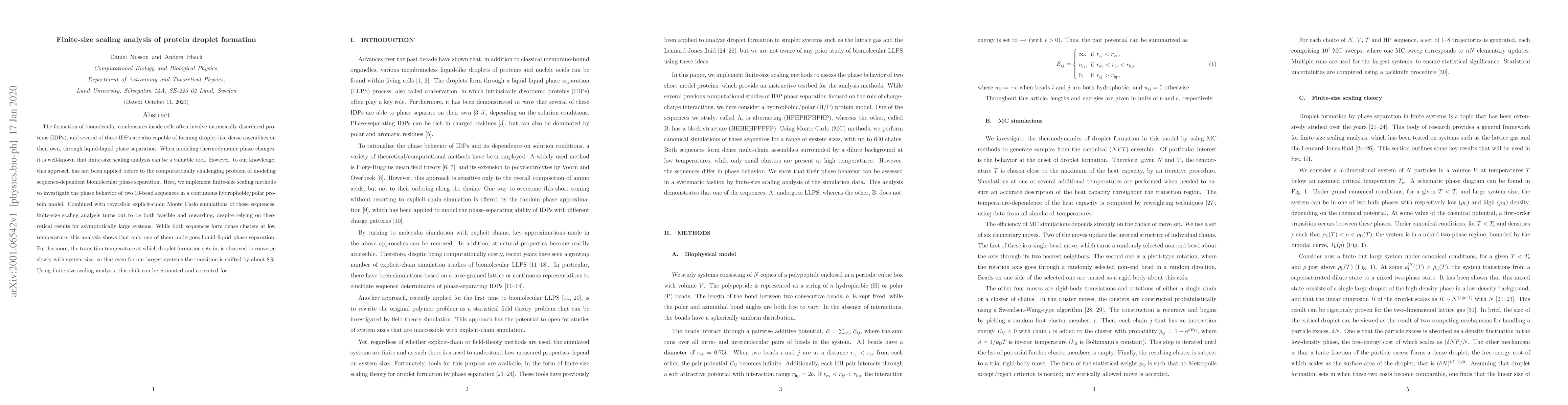 The formation of biomolecular condensates inside cells often involve intrinsically disordered proteins (IDPs), and several of these IDPs are also capable of forming droplet-like dense assemblies on their own, through liquid-liquid phase separation. When modelings thermodynamic phase changes, it is well-known that finite-size scaling analysis can be a valuable tool. However, to our knowledge, this approach has not been applied before to the computationally challenging problem of modeling sequence-dependent biomolecular phase separation. Here, we implement finite-size scaling methods to investigate the phase behavior of two 10-bead sequences in a continuous hydrophobic/polar protein model. Combined with reversible explicit-chain Monte Carlo simulations of these sequences, finite-size scaling analysis turns out to be both feasible and rewarding, despite relying on theoretical results for asymptotically large systems. While both sequences form dense clusters at low temperature, this analysis shows that only one of them undergoes liquid-liquid phase separation. Furthermore, the transition temperature at which droplet formation sets in, is observed to converge slowly with system size, so that even for our largest systems the transition is shifted by about 8%. Using finite-size scaling analysis, this shift can be estimated and corrected for.