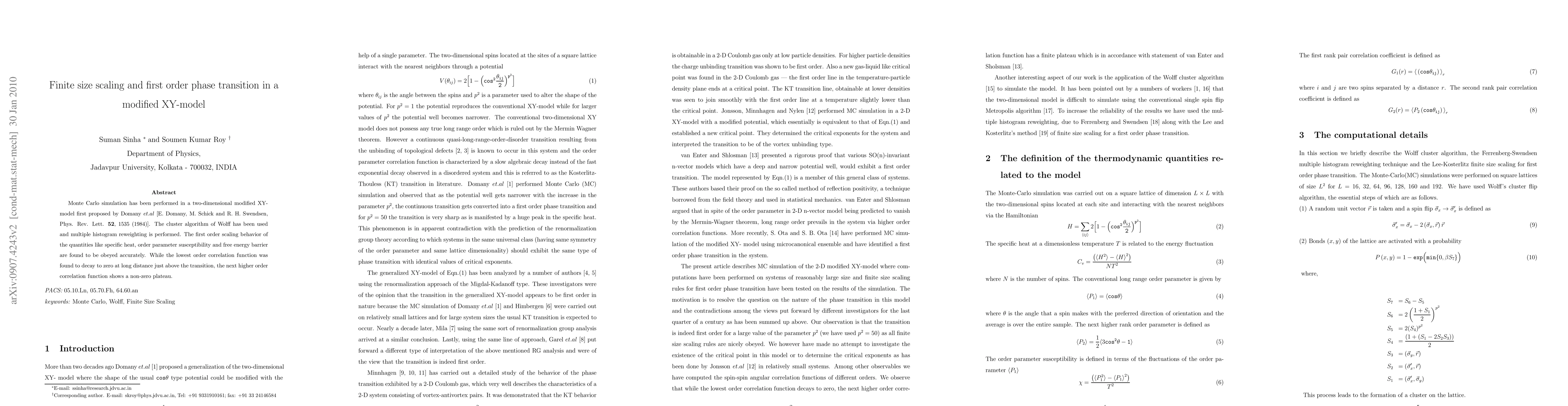 Researchers used Monte Carlo simulation to study a modified XY-model, finding first-order phase transitions with accurate scaling behavior and unique correlation function decay patterns.