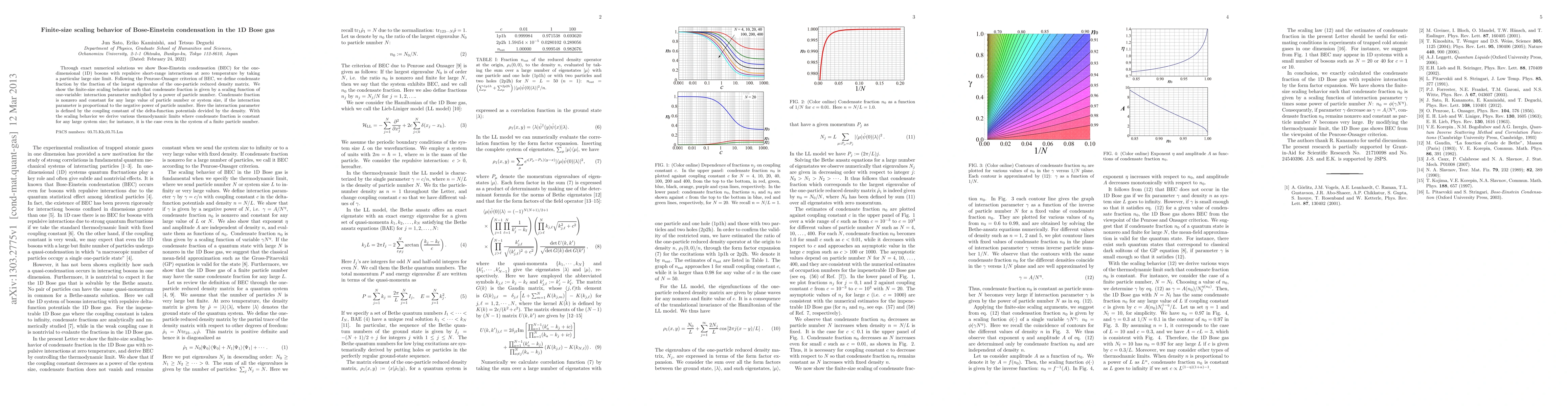 Through exact numerical solutions we show Bose-Einstein condensation (BEC) for the one-dimensional (1D) bosons with repulsive short-range interactions at zero temperature by taking a particular large size limit. Following the Penrose-Onsager criterion of BEC, we define condensate fraction by the fraction of the largest eigenvalue of the one-particle reduced density matrix. % We show the finite-size scaling behavior such that condensate fraction is given by a scaling function of one-variable: interaction parameter multiplied by a power of particle number. Condensate fraction is nonzero and constant for any large value of particle number or system size, if the interaction parameter is proportional to the negative power of particle number. %Here the interaction parameter is defined by the coupling constant of the delta-function potentials devided by the density. %With the scaling behavior we derive various themodynamic limits where condensate fraction is constant for any large system size; for instance, it is the case even in the system of a finite particle number.