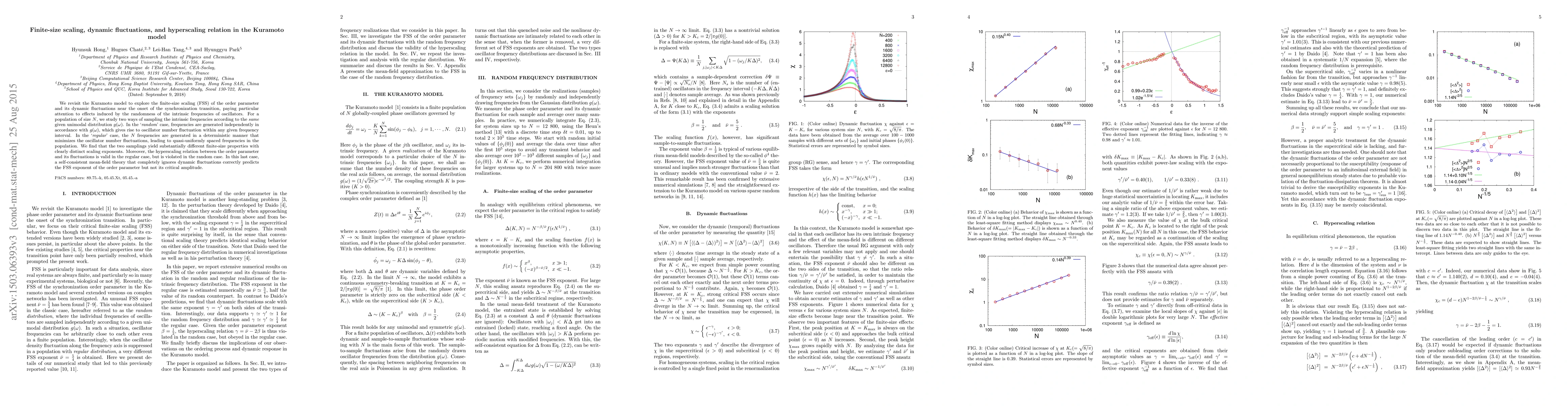 This paper investigates the finite-size scaling of the order parameter and dynamic fluctuations in the Kuramoto model, comparing random and regular sampling of oscillator frequencies. It finds distinct scaling behaviors and a violation of the hyperscaling relation in the random case, while the regular case adheres to the hyperscaling relation.