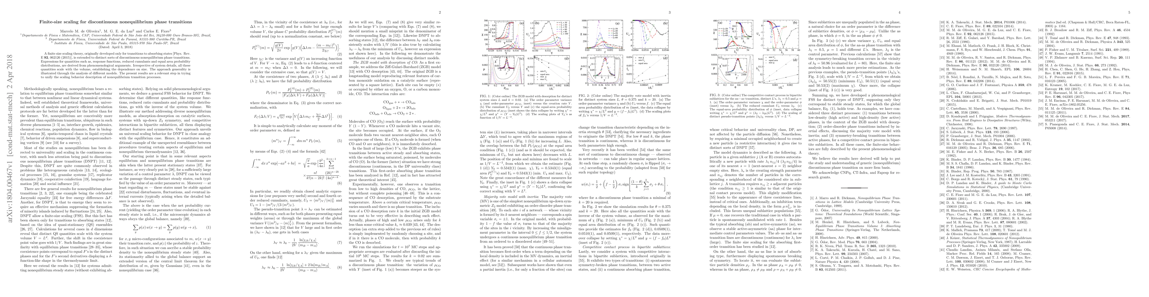 This paper extends finite-size scaling theory to discontinuous nonequilibrium phase transitions, deriving expressions for response functions and cumulants that scale with system volume. The generality of the approach is demonstrated through various model analyses, contributing to the unification of scaling behavior descriptions for nonequilibrium transitions.
