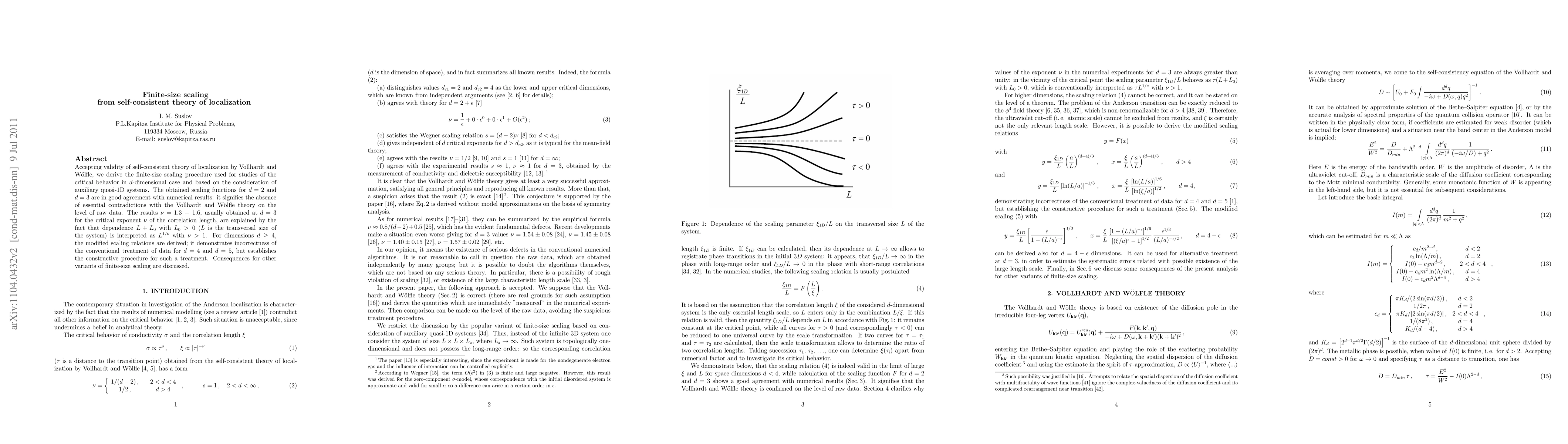 Accepting validity of self-consistent theory of localization by Vollhardt and Woelfle, we derive the finite-size scaling procedure used for studies of the critical behavior in d-dimensional case and based on the use of auxiliary quasi-1D systems. The obtained scaling functions for d=2 and d=3 are in good agreement with numerical results: it signifies the absence of essential contradictions with the Vollhardt and Woelfle theory on the level of raw data. The results \nu=1.3-1.6, usually obtained at d=3 for the critical exponent of the correlation length, are explained by the fact that dependence L+L_0 with L_0>0 (L is the transversal size of the system) is interpreted as L^{1/\nu} with \nu>1. For dimensions d\ge 4, the modified scaling relations are derived; it demonstrates incorrectness of the conventional treatment of data for d=4 and d=5, but establishes the constructive procedure for such a treatment. Consequences for other variants of finite-size scaling are discussed.