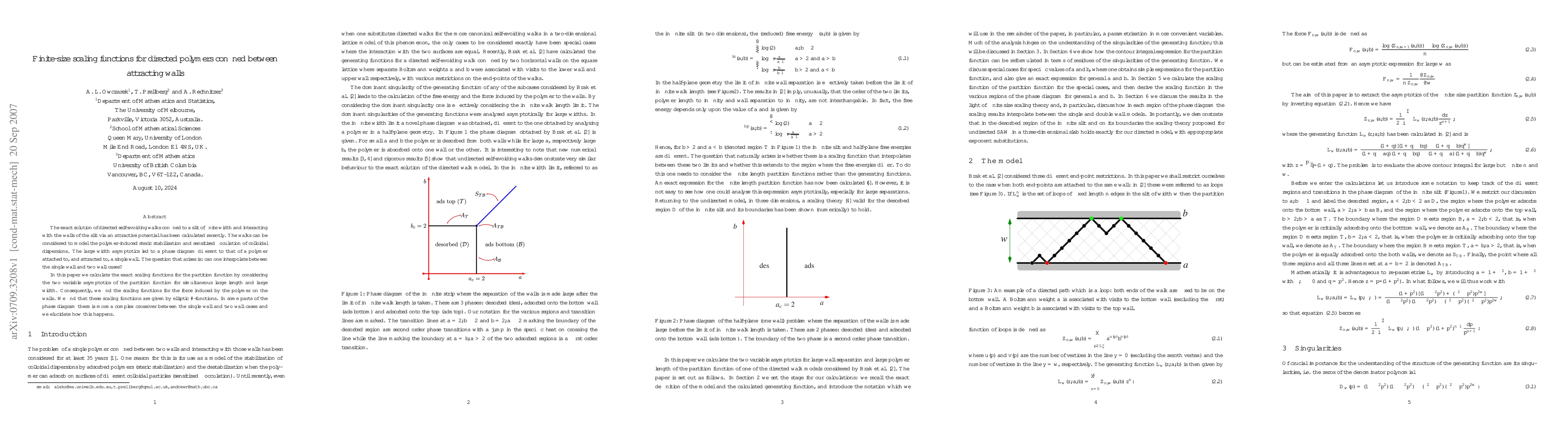 The exact solution of directed self-avoiding walks confined to a slit of finite width and interacting with the walls of the slit via an attractive potential has been calculated recently. The walks can be considered to model the polymer-induced steric stabilisation and sensitised floculation of colloidal dispersions. The large width asymptotics led to a phase diagram different to that of a polymer attached to, and attracted to, a single wall. The question that arises is: can one interpolate between the single wall and two wall cases? In this paper we calculate the exact scaling functions for the partition function by considering the two variable asymptotics of the partition function for simultaneous large length and large width. Consequently, we find the scaling functions for the force induced by the polymer on the walls. We find that these scaling functions are given by elliptic theta-functions. In some parts of the phase diagram there is more a complex crossover between the single wall and two wall cases and we elucidate how this happens.