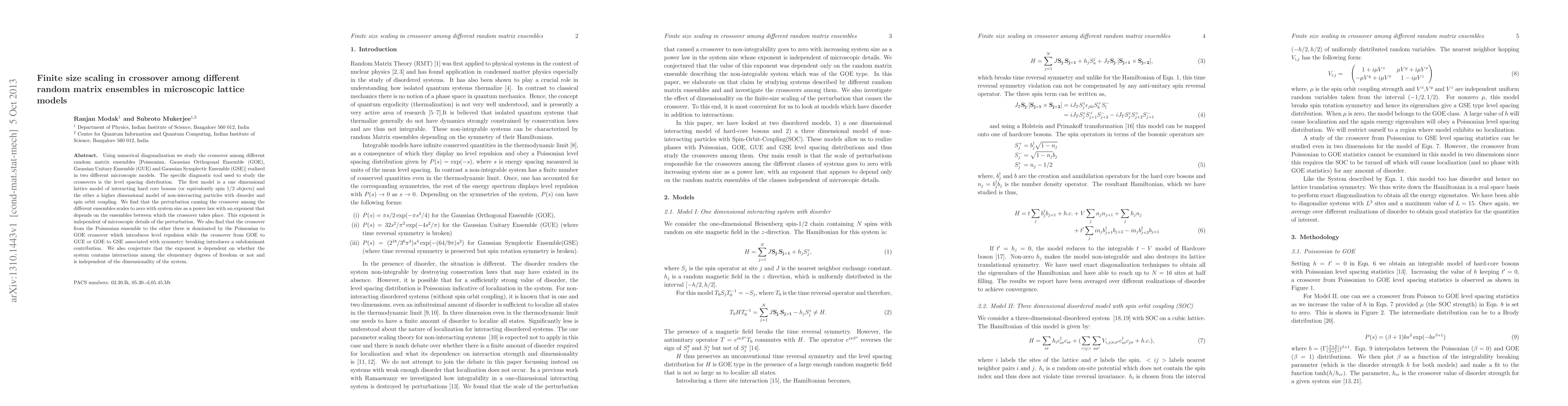 This paper investigates the crossover among different random matrix ensembles in microscopic lattice models using numerical diagonalization and level spacing distribution analysis. The study reveals that the crossover exponent depends on the ensembles involved and scales to zero as a power law with system size, independent of microscopic details.