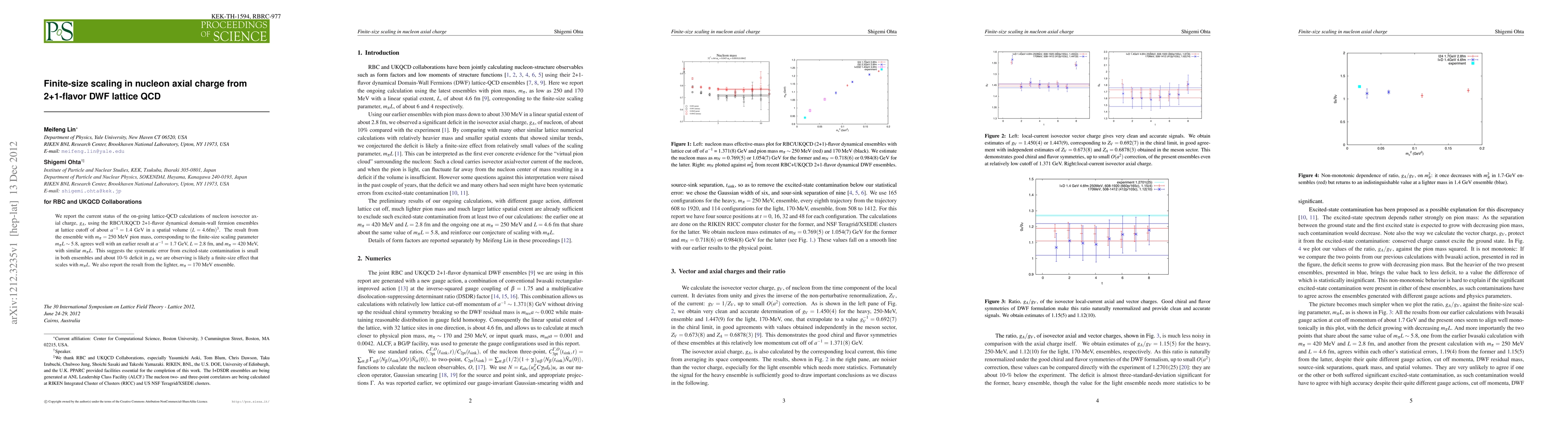 We report the current status of the on-going lattice-QCD calculations of nucleon isovector axial charge, g_A, using the RBC/UKQCD 2+1-flavor dynamical domain-wall fermion ensembles at lattice cutoff of about a^{-1}=1.4 GeV in a spatial volume (L = 4.6 fm)^3. The result from the ensemble with m_\pi = 250 MeV pion mass, corresponding to the finite-size scaling parameter m_\pi L \sim 5.8, agrees well with an earlier result at a^{-1}=1.7 GeV, L = 2.8 fm, and m_\pi = 420 MeV, with similar m_\pi L. This suggests the systematic error from excited-state contamination is small in both ensembles and about 10-% deficit in g_A we are observing is likely a finite-size effect that scales with m_\pi L. We also report the result from the lighter, m_\pi = 170 MeV ensemble.