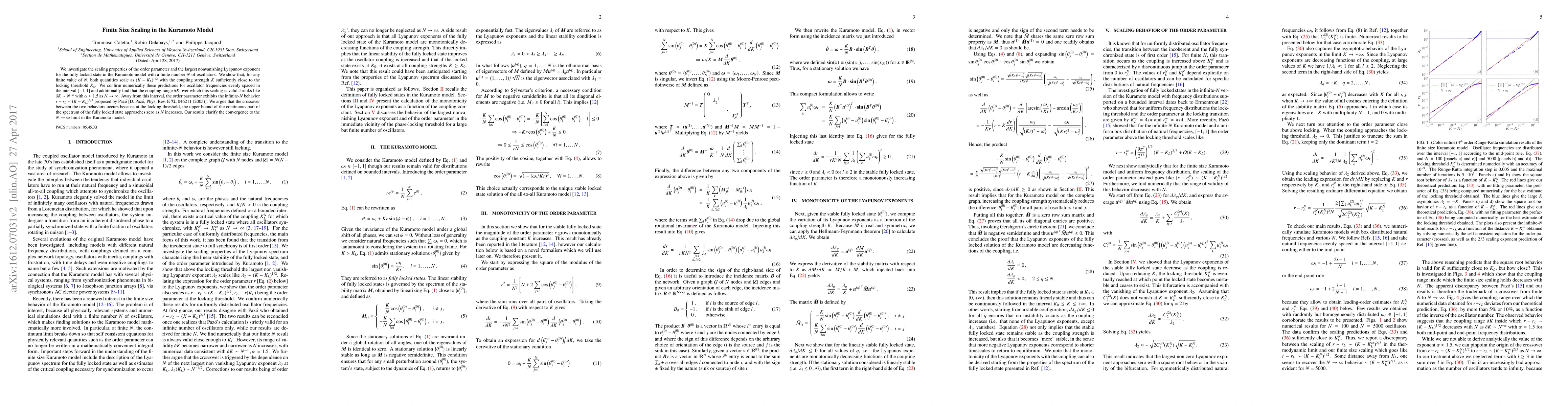 This research explores the Kuramoto model with finite oscillators, showing that the order parameter and largest nonvanishing Lyapunov exponent scale with the coupling strength near the locking threshold. Numerical confirmation was done for evenly spaced frequencies, revealing that the coupling range for this scaling decreases as N grows. The study also identifies a crossover to infinite-N behavior away from the specific frequency interval, clarifying the convergence to the infinite-N limit in the Kuramoto model.