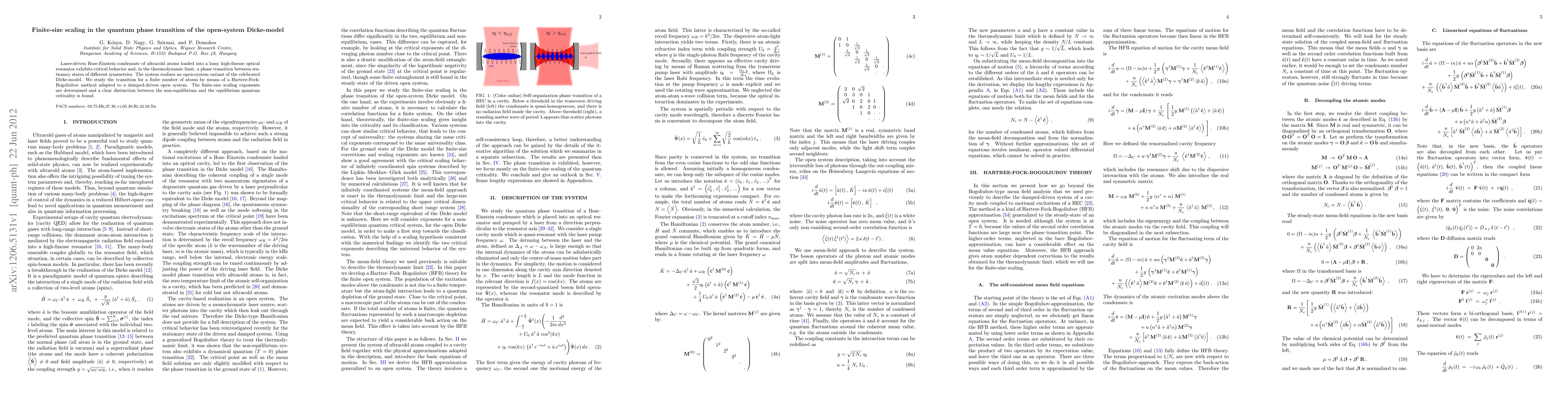 Laser-driven Bose-Einstein condensate of ultracold atoms loaded into a lossy high-finesse optical resonator exhibits critical behavior and, in the thermodynamic limit, a phase transition between stationary states of different symmetries. The system realizes an open-system variant of the celebrated Dicke-model. We study the transition for a finite number of atoms by means of a Hartree-Fock-Bogoliubov method adapted to a damped-driven open system. The finite-size scaling exponents are determined and a clear distinction between the non-equilibrium and the equilibrium quantum criticality is found.