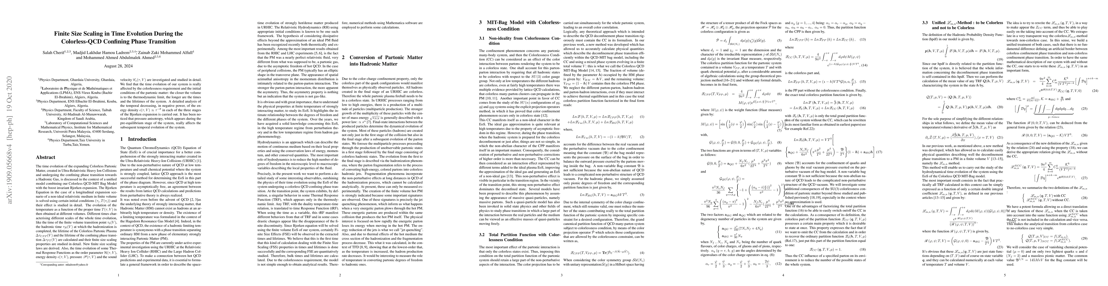 The time evolution of the expanding Colorless Partonic Matter, created in Ultra-Relativistic Heavy Ion Collisions and undergoing the confining phase transition towards a Hadronic Gas, is discussed in the context of a unified model combining our Colorless QCD-MIT Bag Model with the boost invariant Bjorken expansion. The Bjorken Equation in the case of a longitudinal expansion scenario of a non-ideal relativistic medium in finite volume is solved using certain initial conditions $(\tau_i,T(\tau_i))$ and their effect is studied in detail. The evolution of the temperature as a function of the proper time $T(\tau,V)$ is then obtained at different volumes. Different times characterising different scales of the whole time evolution, like the time of the finite volume transition point $\tau_0(V)$, the hadronic time $\tau_H(V)$ at which the hadronization is completed, the lifetime of the Colorless Partonic Plasma $\Delta \tau_{CPP}(V)$ and the lifetime of the confining phase transition $\Delta \tau_{PT}(V)$ are calculated and their finite size scaling properties are studied in detail. New finite size scaling laws are derived. Also, the time evolution of some Thermal Response Functions as the order parameter $\mathcal{H}(\tau,V)$, energy density $\epsilon(\tau,V)$, pressure $\mathscr{P}(\tau,V)$ and the sound velocity $\mathscr{C}_{s}(\tau,V)$ are investigated and studied in detail. We find that the time evolution of our system is really affected by the colorlessness requirement and the initial conditions of the partonic matter: the closer the volume is to the thermodynamic limit, the longer are the times and the lifetimes of the system. A detailed analysis of the temporal decreasing, in negative power, of the energy density $\epsilon(\tau,V) \propto \tau^{-\theta}$ in each of the three stages of the Bjorken expansion is carried out.