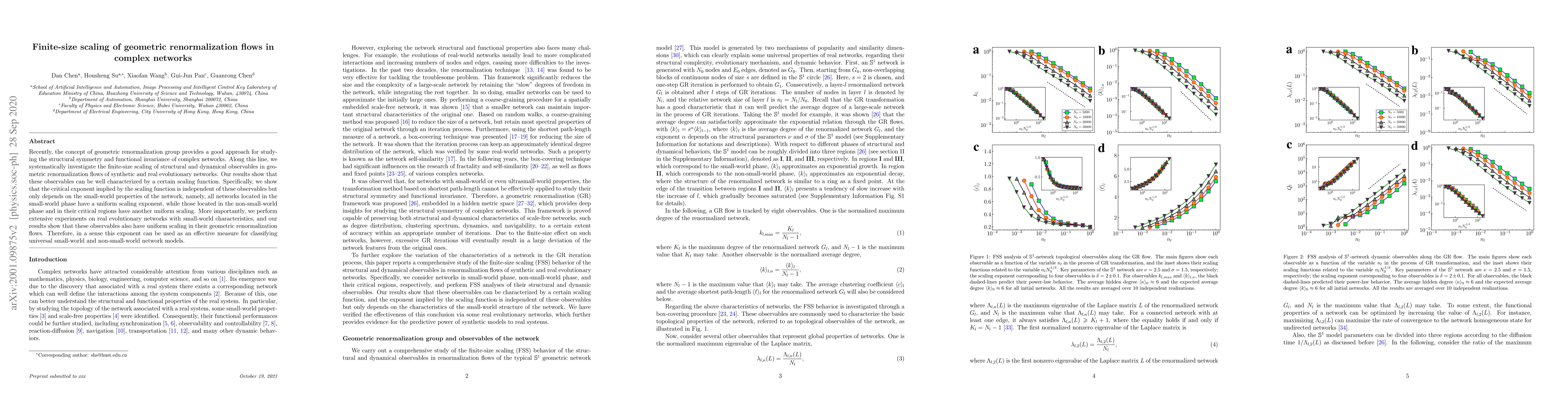 Recently, the concept of geometric renormalization group provides a good approach for studying the structural symmetry and functional invariance of complex networks. Along this line, we systematically investigate the finite-size scaling of structural and dynamical observables in geometric renormalization flows of synthetic and real evolutionary networks. Our results show that these observables can be well characterized by a certain scaling function. Specifically, we show that the critical exponent implied by the scaling function is independent of these observables but only depends on the small-world properties of the network, namely, all networks located in the small-world phase have a uniform scaling exponent, while those located in the non-small-world phase and in their critical regions have another uniform scaling. More importantly, we perform extensive experiments on real evolutionary networks with small-world characteristics, and our results show that these observables also have uniform scaling in their geometric renormalization flows. Therefore, in a sense this exponent can be used as an effective measure for classifying universal small-world and non-small-world network models.
