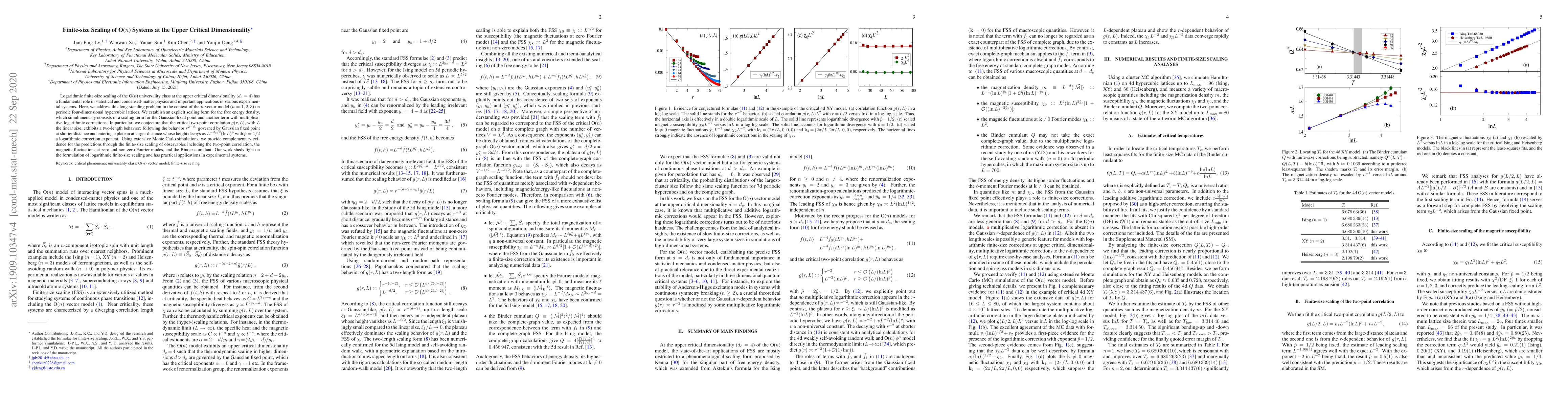 This paper investigates the logarithmic finite-size scaling of O($n$) systems at the upper critical dimensionality ($d_c=4$), establishing an explicit scaling form for the free energy density with Gaussian and logarithmic corrections. It provides evidence through Monte Carlo simulations and suggests a two-length behavior for critical two-point correlation functions, with practical implications for experimental systems.