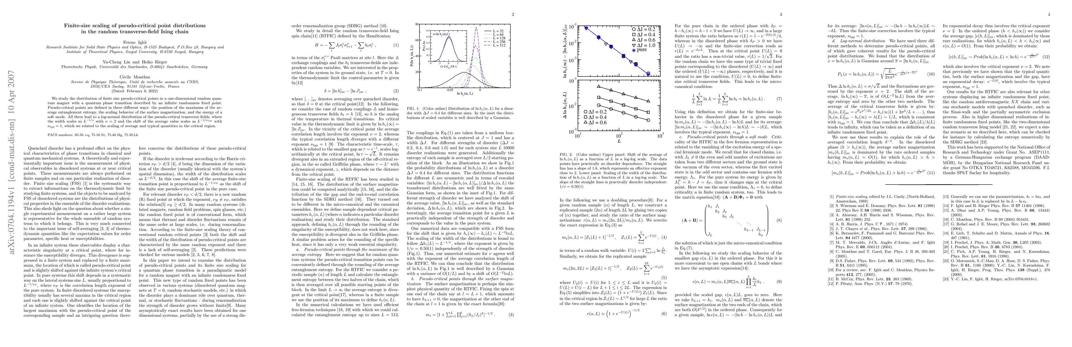 The study examines pseudo-critical points in a random transverse-field Ising chain, revealing a log-normal distribution characterized by width scaling as $L^{-1/2}$ and average value shift scaling as $L^{-1}$. These pseudo-critical points are derived from entanglement entropy, surface magnetization, and soft mode energy.