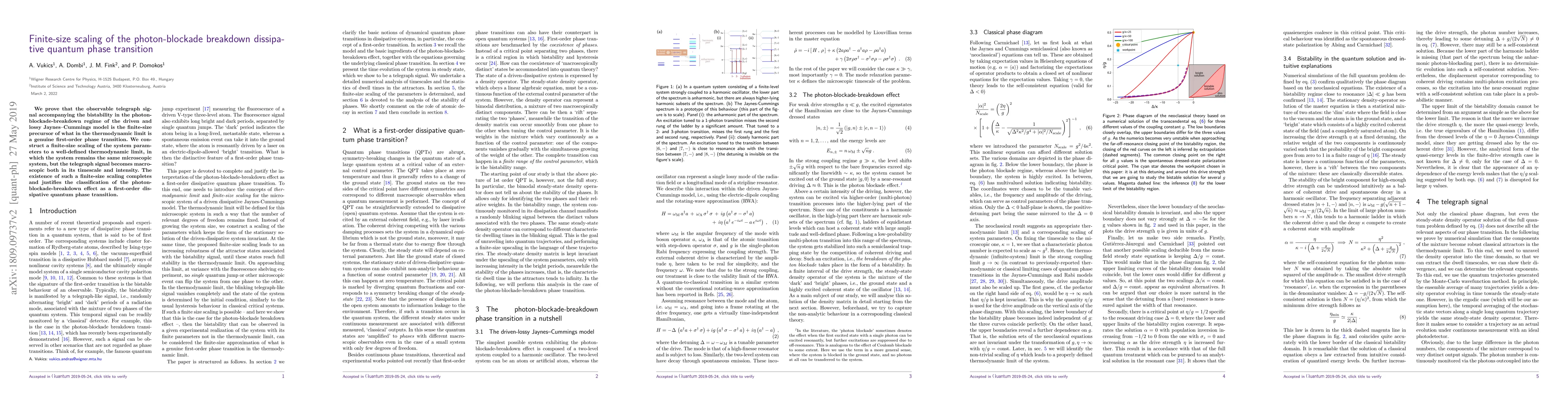 We prove that the observable telegraph signal accompanying the bistability in the photon-blockade-breakdown regime of the driven and lossy Jaynes--Cummings model is the finite-size precursor of what in the thermodynamic limit is a genuine first-order phase transition. We construct a finite-size scaling of the system parameters to a well-defined thermodynamic limit, in which the system remains the same microscopic system, but the telegraph signal becomes macroscopic both in its timescale and intensity. The existence of such a finite-size scaling completes and justifies the classification of the photon-blockade-breakdown effect as a first-order dissipative quantum phase transition.