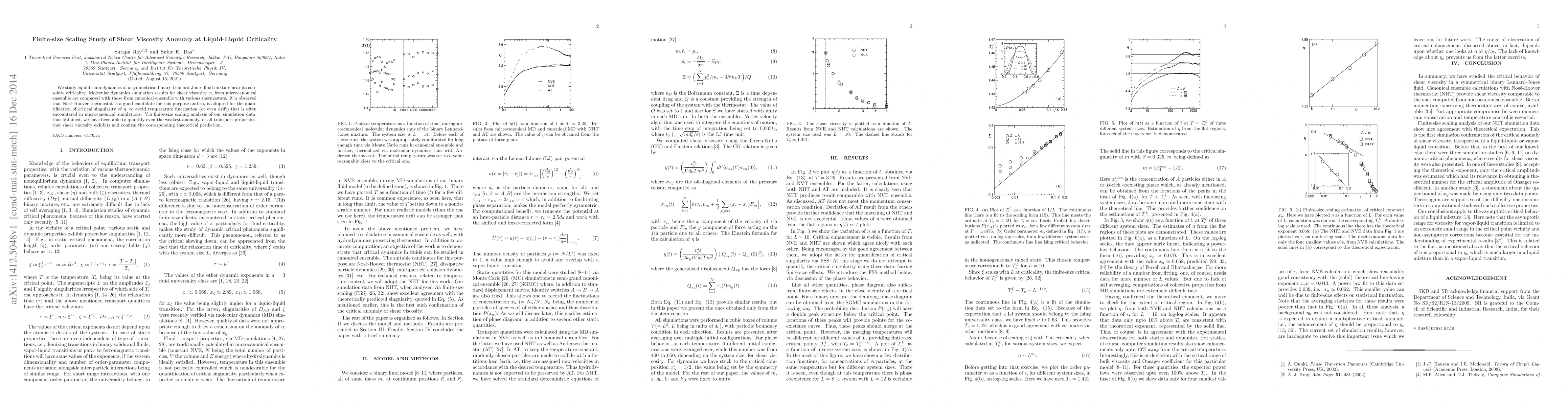 This study uses molecular dynamics simulations to investigate the shear viscosity anomaly near liquid-liquid criticality in a symmetrical binary Lennard-Jones fluid mixture. The Nosé-Hoover thermostat is found effective in avoiding temperature fluctuations, and finite-size scaling analysis confirms the theoretical prediction of the critical singularity in shear viscosity.