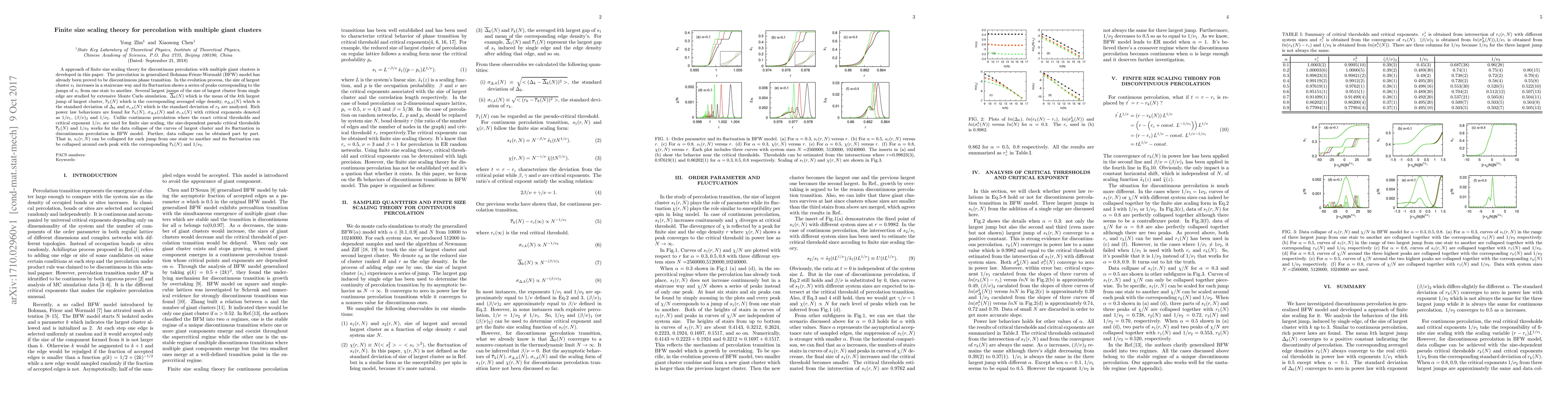 A approach of finite size scaling theory for discontinous percolation with multiple giant clusters is developed in this paper. The percolation in generalized Bohman-Frieze-Wormald (BFW) model has already been proved to be discontinuous phase transition. In the evolution process, the size of largest cluster $s_1$ increases in a stairscase way and its fluctuation shows a series of peaks corresponding to the jumps of $s_1$ from one stair to another. Several largest jumps of the size of largest cluster from single edge are studied by extensive Monte Carlo simulation. $\overline{\Delta}_k(N)$ which is the mean of the $k$th largest jump of largest cluster, $\overline{r}_k(N)$ which is the corresponding averaged edge density, $\sigma_{\Delta,k}(N)$ which is the standard deviation of $\Delta_k$ and $\sigma_{r,k}(N)$ which is the standard deviation of $r_k$ are analyzed. Rich power law behaviours are found for $\overline{r}_k(N)$, $\sigma_{\Delta,k}(N)$ and $\sigma_{r,k}(N)$ with critical exponents denoted as $1/\nu_1$, $(\beta/\nu)_2$ and $1/\nu_2$. Unlike continuous percolation where the exact critical thresholds and critical exponent $1/\nu_1$ are used for finite size scaling, the size-dependent pseudo critical thresholds $\overline{r}_k(N)$ and $1/\nu_2$ works for the data collapse of the curves of largest cluster and its fluctuation in discontinuous percolation in BFW model. Further, data collapse can be obtained part by part. That is, $s_1(r,N)$ can be collapsed for each jump from one stair to another and its fluctuation can be collapsed around each peak with the corresponding $\overline{r}_k(N)$ and $1/\nu_2$.