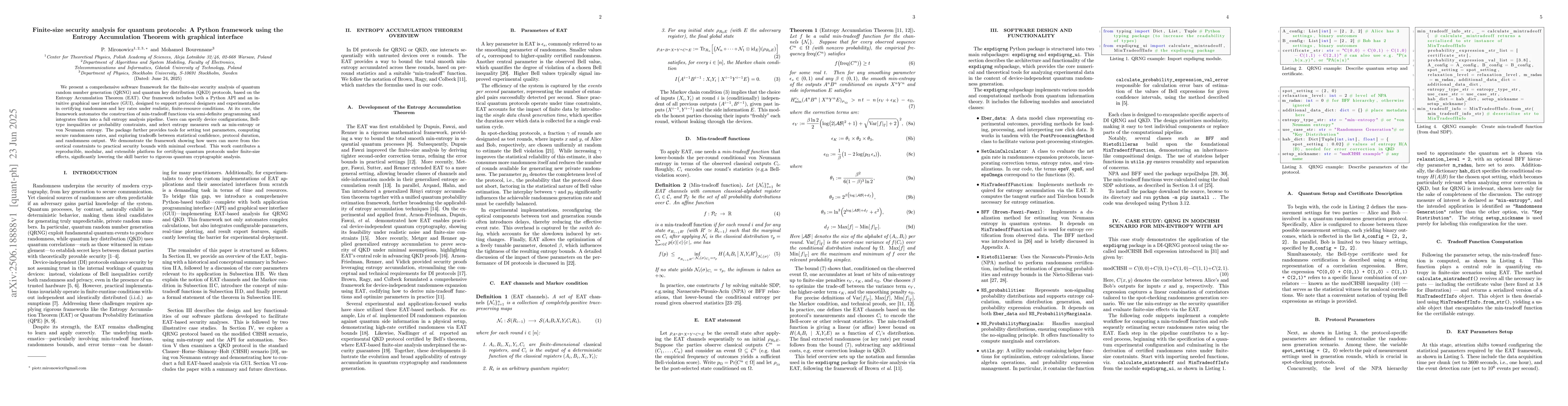 We present a comprehensive software framework for the finite-size security analysis of quantum random number generation (QRNG) and quantum key distribution (QKD) protocols, based on the Entropy Accumulation Theorem (EAT). Our framework includes both a Python API and an intuitive graphical user interface (GUI), designed to support protocol designers and experimentalists in certifying randomness and key rates under realistic, finite-resource conditions. At its core, the framework automates the construction of min-tradeoff functions via semi-definite programming and integrates them into a full entropy analysis pipeline. Users can specify device configurations, Bell-type inequalities or probability constraints, and select entropy measures such as min-entropy or von Neumann entropy. The package further provides tools for setting test parameters, computing secure randomness rates, and exploring tradeoffs between statistical confidence, protocol duration, and randomness output. We demonstrate the framework showing how users can move from theoretical constraints to practical security bounds with minimal overhead. This work contributes a reproducible, modular, and extensible platform for certifying quantum protocols under finite-size effects, significantly lowering the skill barrier to rigorous quantum cryptographic analysis.