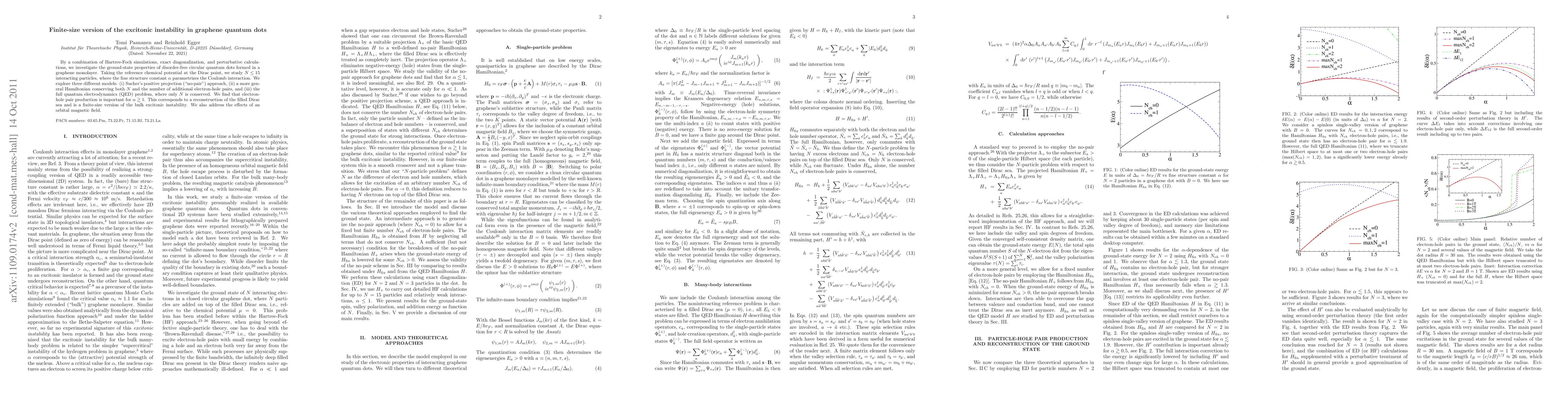 By a combination of Hartree-Fock simulations, exact diagonalization, and perturbative calculations, we investigate the ground-state properties of disorder-free circular quantum dots formed in a graphene monolayer. Taking the reference chemical potential at the Dirac point, we study N \leq 15 interacting particles, where the fine structure constant {\alpha} parametrizes the Coulomb interaction. We explore three different theoretical concepts: (i) Sucher's positive projection ("no-pair") approach, (ii) a more general Hamiltonian conserving both N and the number of additional electron-hole pairs, and (iii) the full quantum electrodynamics (QED) problem, where only N is conserved. We find that electron-hole pair production is important for {\alpha} 1. This corresponds to a reconstruction of the filled Dirac sea and is a finite-size version of the bulk excitonic instability. We also address the effects of an orbital magnetic field.