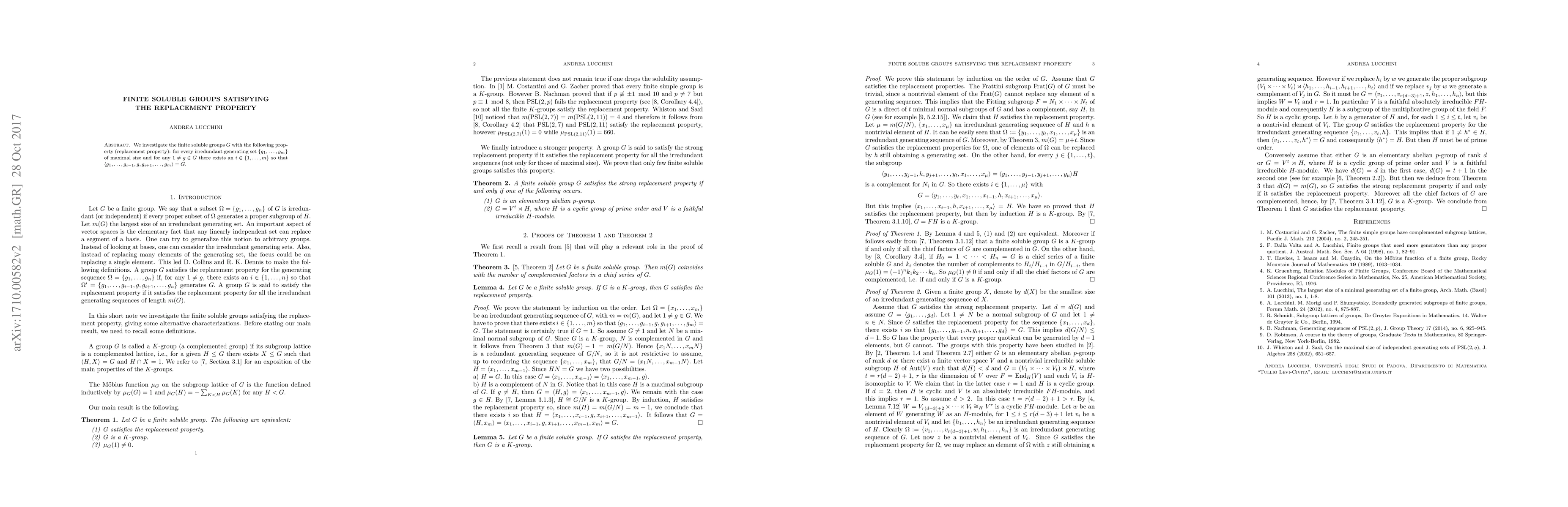 We investigate the finite soluble groups $G$ with the following property (replacement property): for every irredundant generating set $\{g_1,\dots,g_m\}$ of maximal size and for any $1\neq g\in G$ there exists an $i\in \{1,\dots,m\}$ so that $\langle g_1,\dots,g_{i-1},g,g_{i+1},\dots,g_m\rangle=G.$