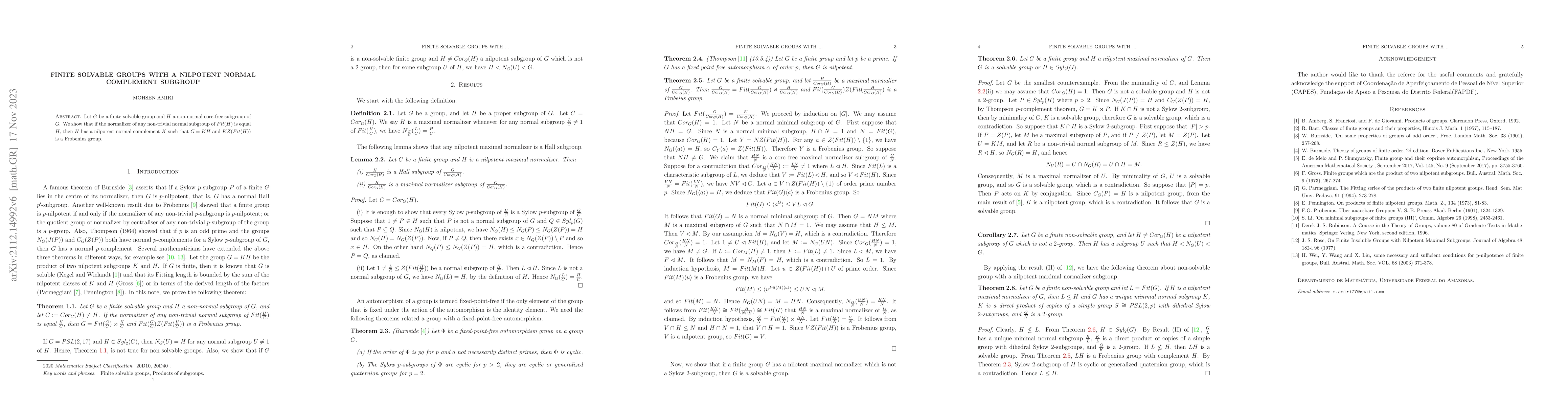 This paper proves that for a finite solvable group $G$ with a non-normal core-free subgroup $H$, if the normalizer of any non-trivial normal subgroup of $Fit(H)$ is $H$, then $H$ possesses a nilpotent normal complement $K$ such that $G=KH$ and $KZ(Fit(H))$ forms a Frobenius group.