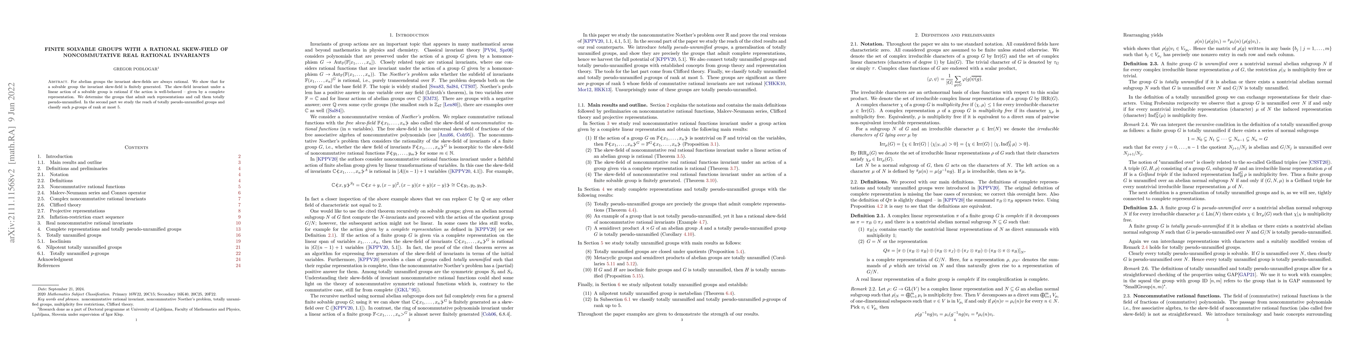 We consider the Noether's problem on the noncommutative real rational functions invariant under the linear action of a finite group. For abelian groups the invariant skew-fields are always rational. We show that for a solvable group the invariant skew-field is finitely generated. The skew-field invariant under a linear action of a solvable group is rational if the action is well-behaved -- given by a so-called complete representation. We determine the groups that admit such representations and call them totally psuedo-unramified. In the second part we study the reach of totally psuedo-unramified groups and classify totally pseudo-unramified p-groups of rank at most 5.