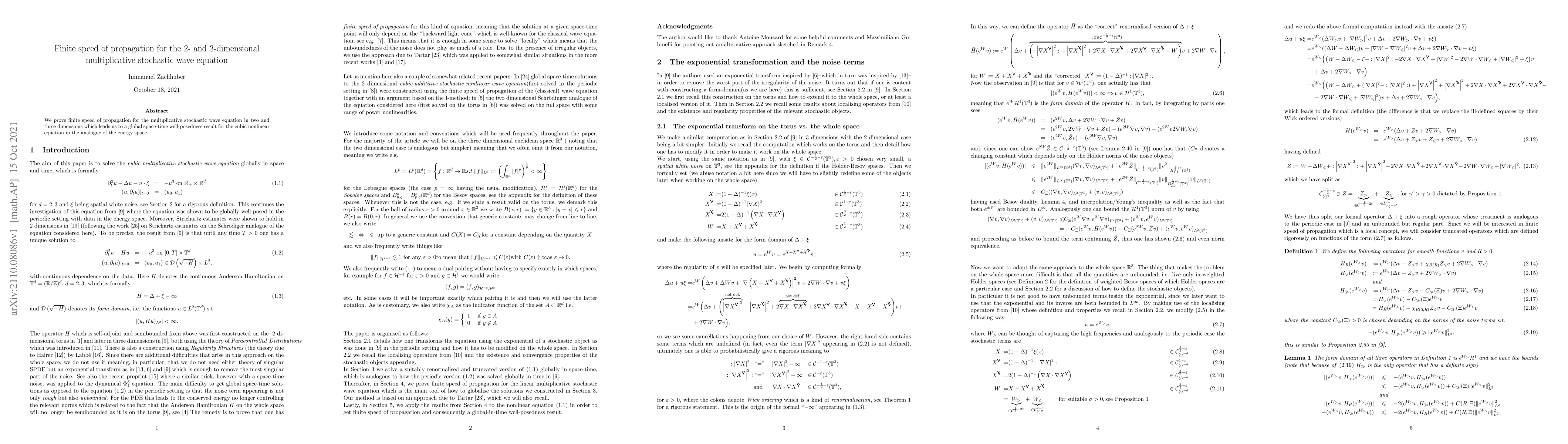 We prove finite speed of propagation for the multiplicative stochastic wave equation in two and three dimensions which leads us to a global space-time well-posedness result for the cubic nonlinear equation in the analogue of the energy space.