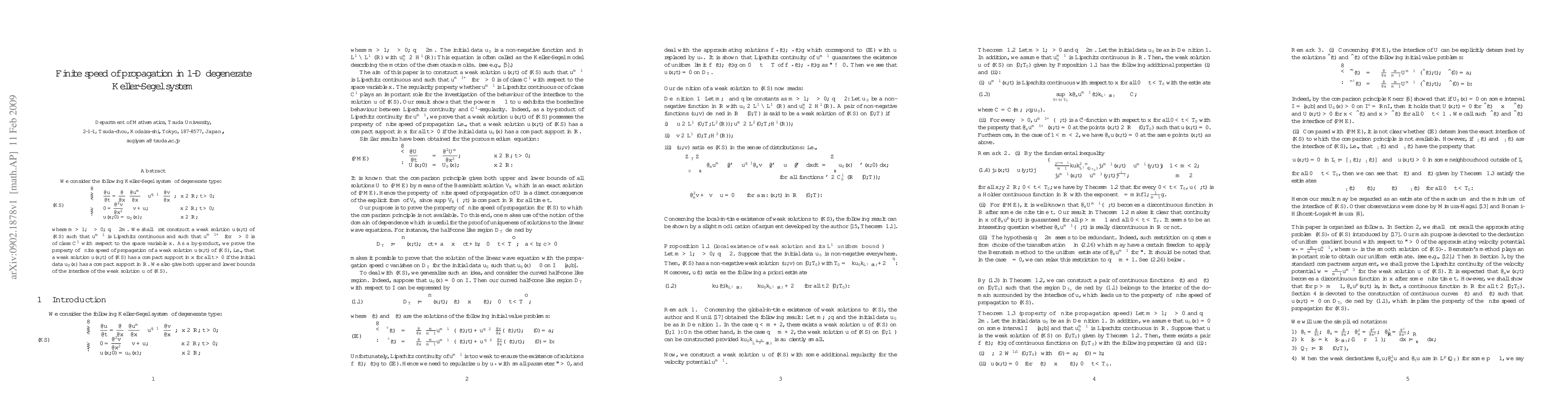 We consider the following Keller-Segel system of degenerate type: \partial u / \partial t = \partial / \partial x (\partial u^m / \partial x - u^{q-1} \cdot \partial v / \partial x), x \in \R, t>0, \partial^2 v / \partial x^2 - \gamma v + u, x \in \R, t>0, u(x,0) = u_0(x), x \in \R, where $m>1, \gamma > 0, q \ge 2m$. We shall first construct a weak solution $u(x,t)$ of (KS) such that $u^{m-1}$ is Lipschitz continuous and such that $\displaystyle u^{m-1+\delta}$ for $\delta>0$ is of class $C^1$ with respect to the space variable $x$. As a by-product, we prove the property of finite speed of propagation of a weak solution $u(x,t)$ of (KS), {\it i.e.,} that a weak solution $u(x,t)$ of (KS) has a compact support in $x$ for all $t>0$ if the initial data $u_0(x)$ has a compact support in $\R$. We also give both upper and lower bounds of the interface of the weak solution $u$ of (KS).