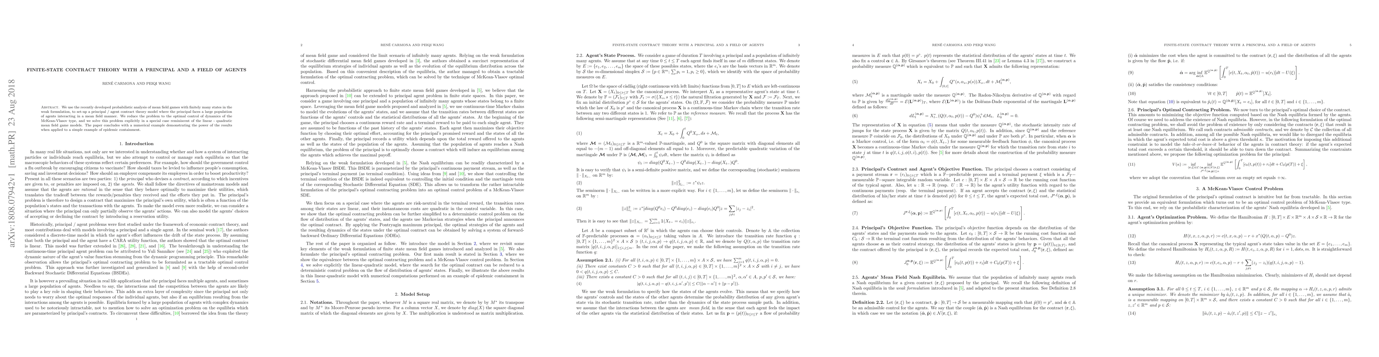 We use the recently developed probabilistic analysis of mean field games with finitely many states in the weak formulation, to set-up a principal / agent contract theory model where the principal faces a large population of agents interacting in a mean field manner. We reduce the problem to the optimal control of dynamics of the McKean-Vlasov type, and we solve this problem explicitly in a special case reminiscent of the linear - quadratic mean field game models. The paper concludes with a numerical example demonstrating the power of the results when applied to a simple example of epidemic containment.