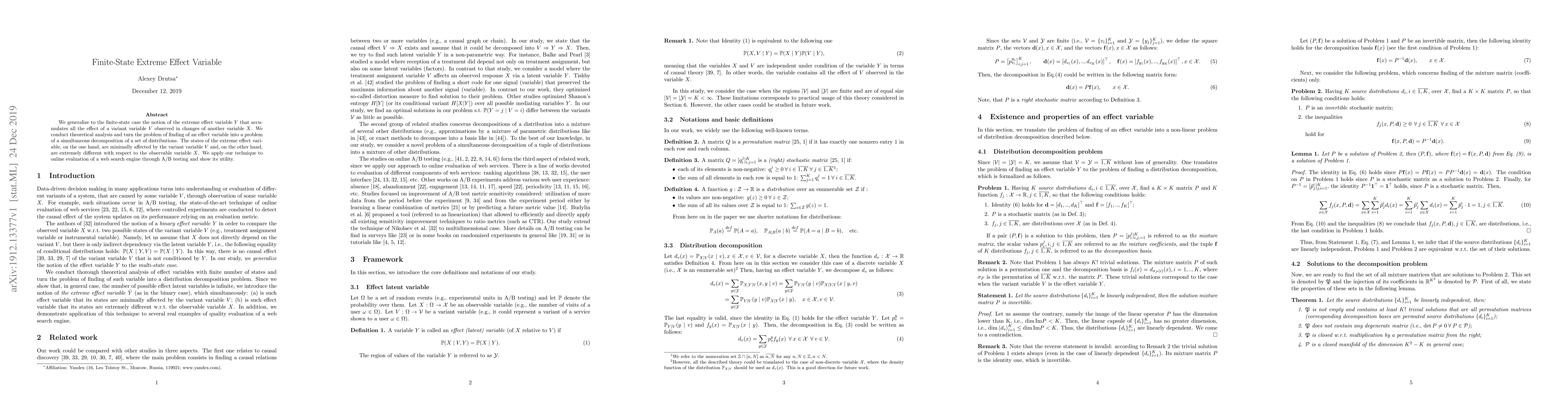The paper generalizes the notion of the extreme effect variable to the finite-state case, transforming the problem of finding an effect variable into a simultaneous decomposition of distributions. It applies this technique to online evaluation of a web search engine through A/B testing.