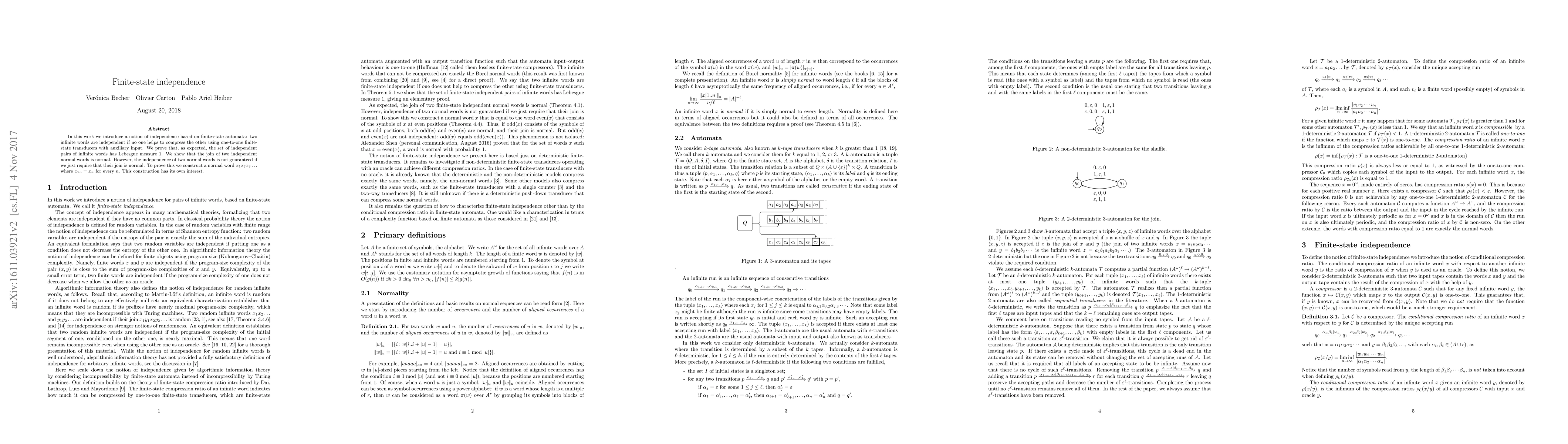 In this work we introduce a notion of independence based on finite-state automata: two infinite words are independent if no one helps to compress the other using one-to-one finite-state transducers with auxiliary input. We prove that, as expected, the set of independent pairs of infinite words has Lebesgue measure 1. We show that the join of two independent normal words is normal. However, the independence of two normal words is not guaranteed if we just require that their join is normal. To prove this we construct a normal word $x_1x_2x_3\ldots$ where $x_{2n}=x_n$ for every $n$.
