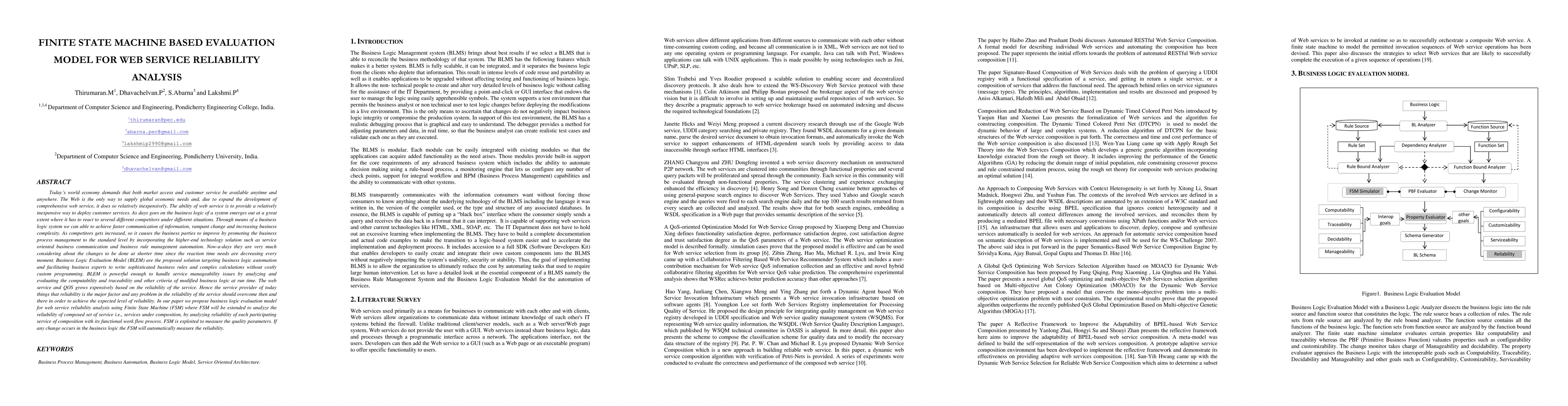 Now-a-days they are very much considering about the changes to be done at shorter time since the reaction time needs are decreasing every moment. Business Logic Evaluation Model (BLEM) are the proposed solution targeting business logic automation and facilitating business experts to write sophisticated business rules and complex calculations without costly custom programming. BLEM is powerful enough to handle service manageability issues by analyzing and evaluating the computability and traceability and other criteria of modified business logic at run time. The web service and QOS grows expensively based on the reliability of the service. Hence the service provider of today things that reliability is the major factor and any problem in the reliability of the service should overcome then and there in order to achieve the expected level of reliability. In our paper we propose business logic evaluation model for web service reliability analysis using Finite State Machine (FSM) where FSM will be extended to analyze the reliability of composed set of service i.e., services under composition, by analyzing reliability of each participating service of composition with its functional work flow process. FSM is exploited to measure the quality parameters. If any change occurs in the business logic the FSM will automatically measure the reliability.