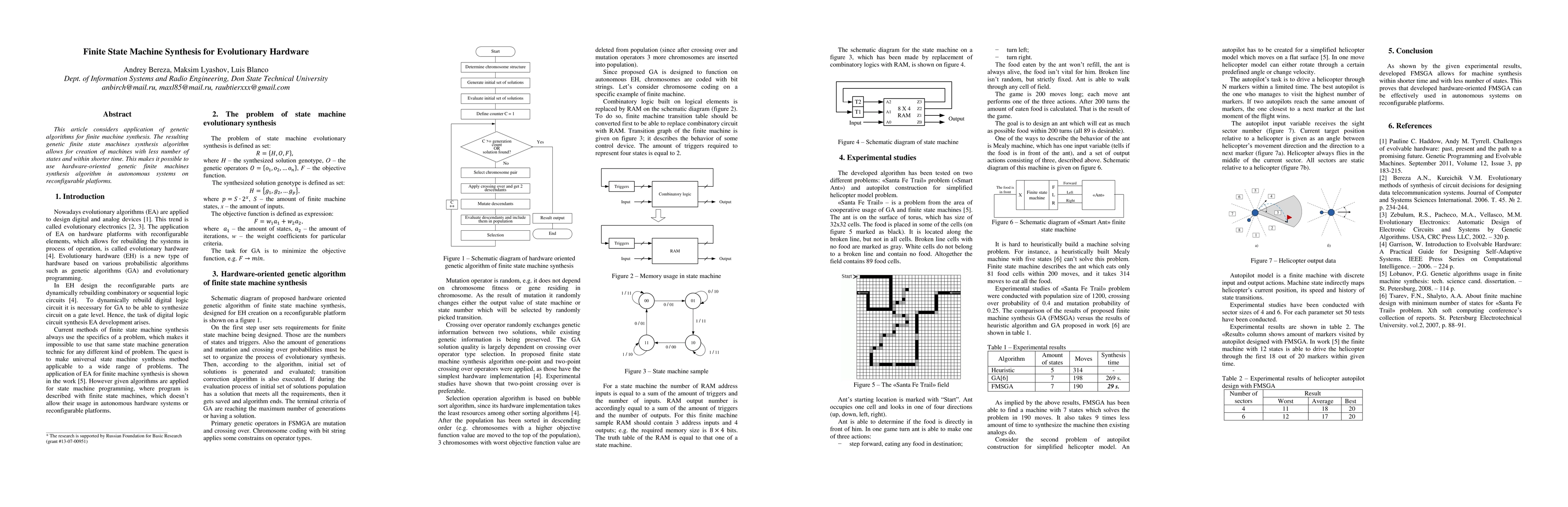 This paper explores the use of genetic algorithms for synthesizing finite state machines, achieving fewer states and faster synthesis times, which is beneficial for autonomous systems on reconfigurable hardware platforms.