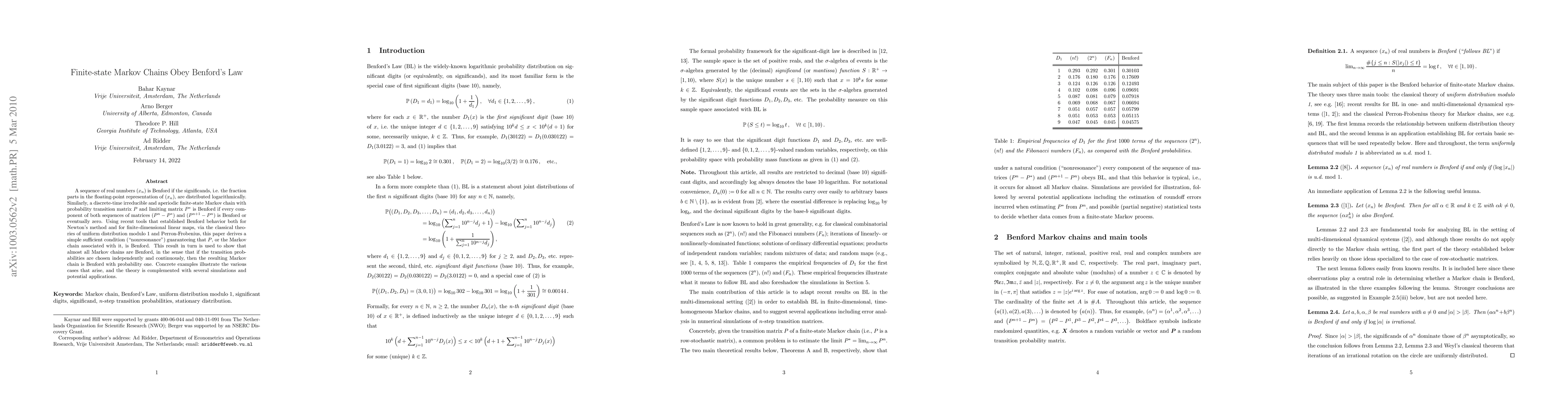 A new study proves that many Markov chains follow Benford's Law, a statistical phenomenon where numbers tend to have leading digits that favor smaller numbers, even in the absence of human bias. The research provides sufficient conditions for nonresonant Markov chains to be Benford and shows that nearly all randomly generated chains obey this law.