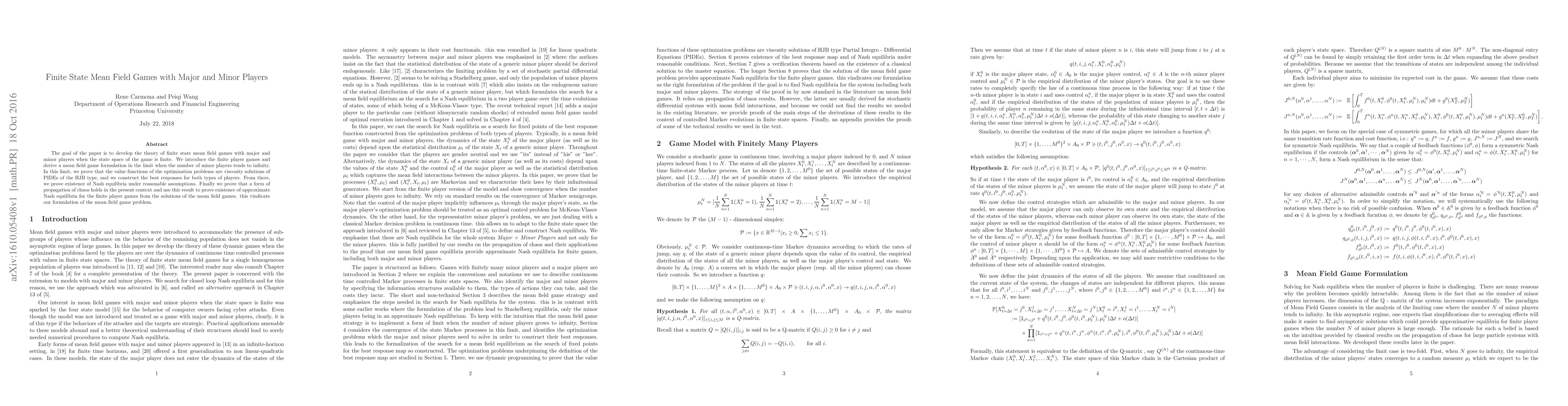 This paper develops the theory of finite state mean field games involving major and minor players within a finite state space, proving the existence of Nash equilibria and establishing a propagation of chaos. It introduces finite player games and constructs mean field game formulations, showing the value functions are viscosity solutions of HJB-type partial differential equations.