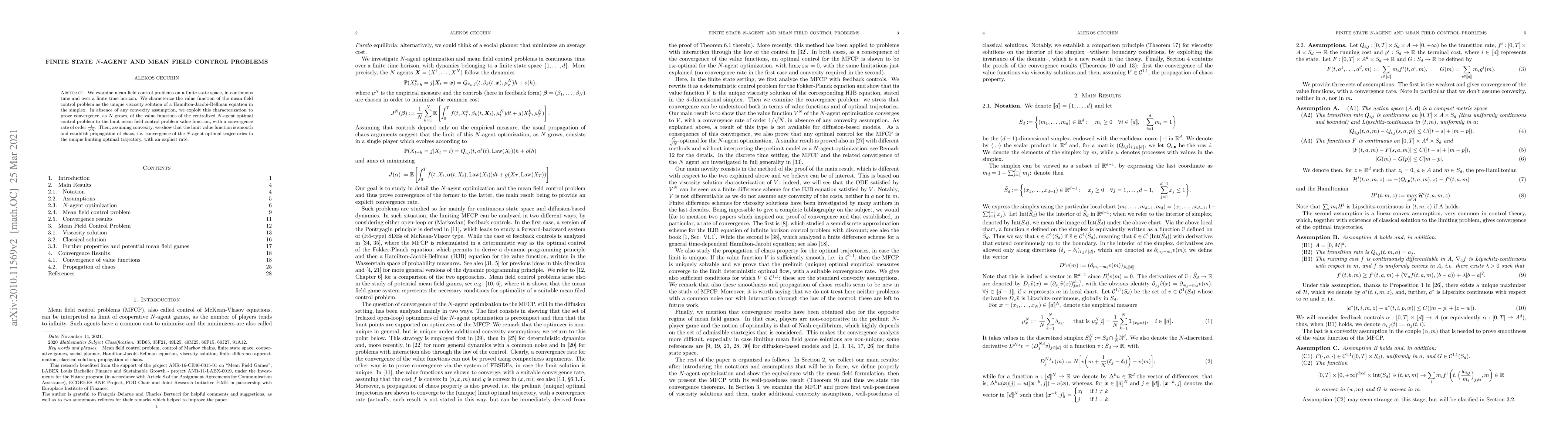 Researchers develop a framework for analyzing mean field control problems on finite state spaces, showing convergence of centralized N-agent optimal control to limit mean field control value function with a rate of 1/sqrt(N) under non-convexity assumptions, and explicit rates under convexity.