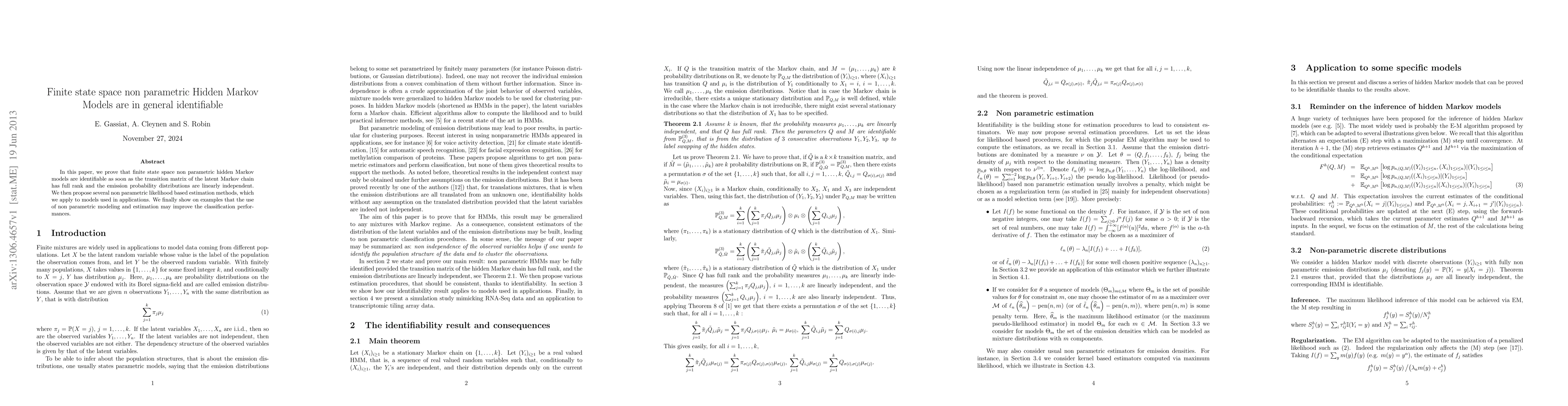 This paper proves that finite state space non-parametric hidden Markov models are identifiable under full rank transition matrices and linearly independent emission distributions. It also introduces several non-parametric likelihood-based estimation methods and demonstrates improved classification performance through non-parametric modeling.