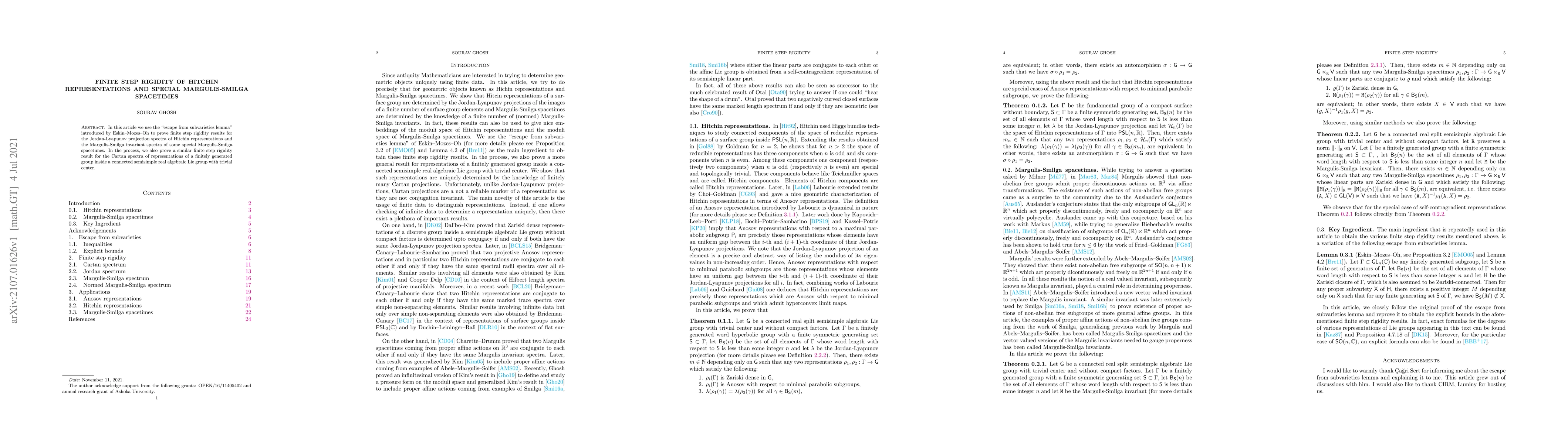 This paper proves finite step rigidity for Hitchin representations and special Margulis-Smilga spacetimes using the "escape from subvarieties lemma," also establishing a similar result for Cartan spectra of representations of finitely generated groups in connected semisimple real algebraic Lie groups.