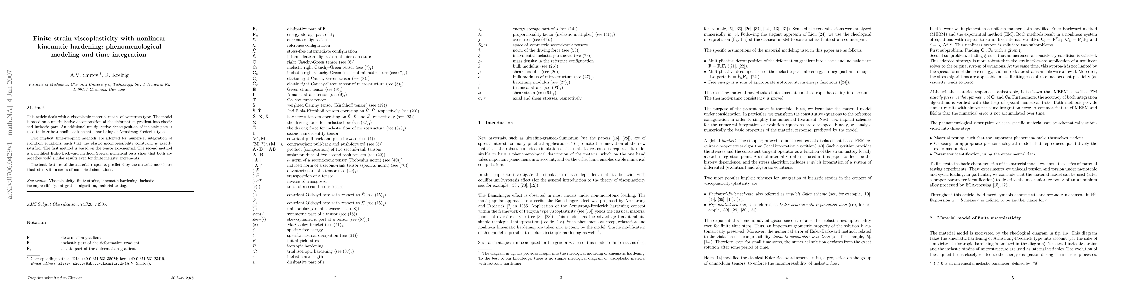 This article deals with a viscoplastic material model of overstress type. The model is based on a multiplicative decomposition of the deformation gradient into elastic and inelastic part. An additional multiplicative decomposition of inelastic part is used to describe a nonlinear kinematic hardening of Armstrong-Frederick type. Two implicit time-stepping methods are adopted for numerical integration of evolution equations, such that the plastic incompressibility constraint is exactly satisfied. The first method is based on the tensor exponential. The second method is a modified Euler-Backward method. Special numerical tests show that both approaches yield similar results even for finite inelastic increments. The basic features of the material response, predicted by the material model, are illustrated with a series of numerical simulations.