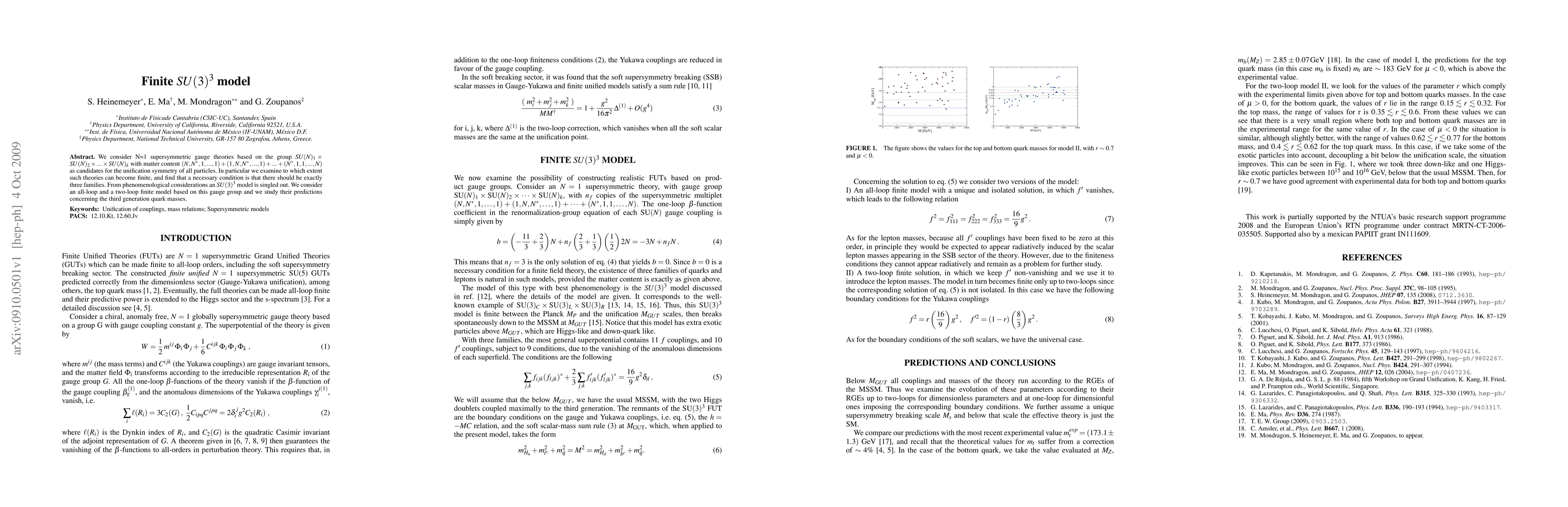 This paper explores N=1 supersymmetric gauge theories based on the SU(3)^3 group, investigating their potential as unification symmetries for particle physics. The study finds that a finite model necessitates exactly three families, leading to a focus on an SU(3)^3 model, and examines its predictions for third-generation quark masses.