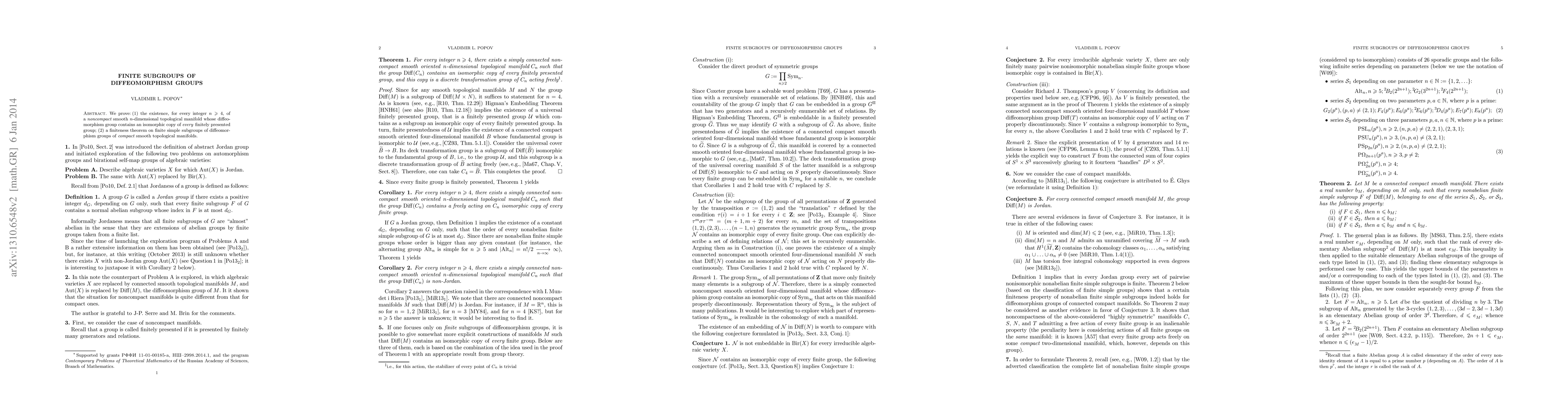The paper establishes the existence of noncompact n-dimensional manifolds, for n > 3, whose diffeomorphism groups contain isomorphic copies of any finitely presented group, and presents a finiteness theorem regarding finite simple subgroups in the diffeomorphism groups of compact smooth manifolds.