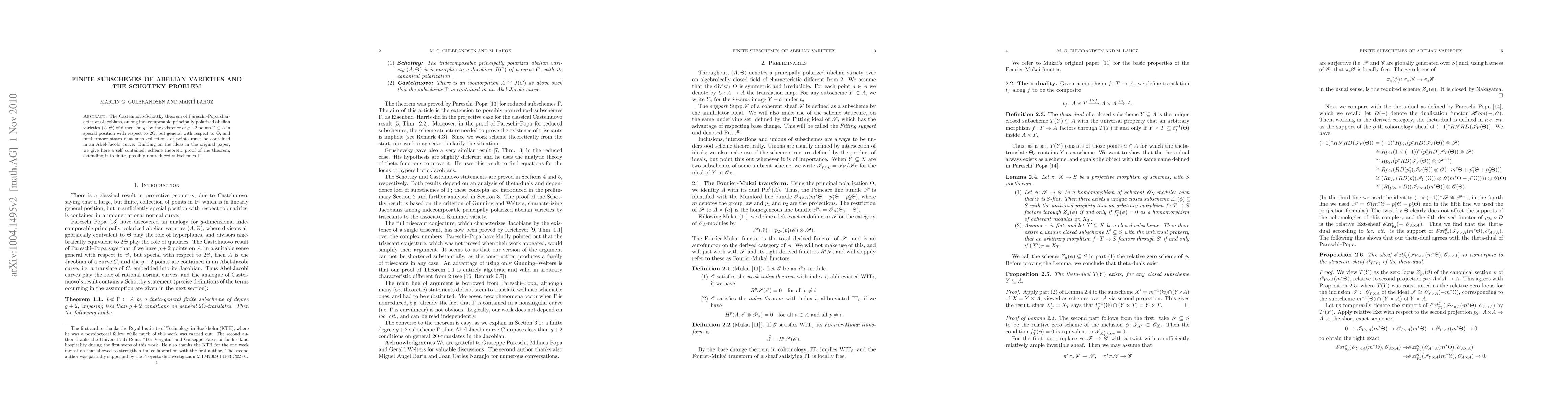 This paper provides a scheme-theoretic proof of the Castelnuovo-Schottky theorem, extending it to finite subschemes of abelian varieties, and characterizes Jacobians by the existence of specific point collections with respect to polarizations. This work builds on the original theorem by Pareschi and Popa.