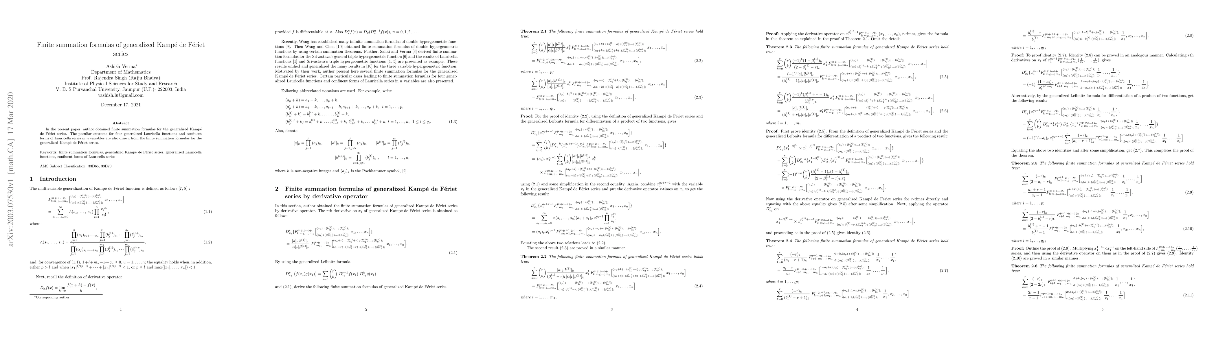 This paper derives finite summation formulas for the generalized Kampé de Fériet series, extending the results to four generalized Lauricella functions and confluent forms in $n$ variables. The findings provide new insights into the summation properties of these complex series.