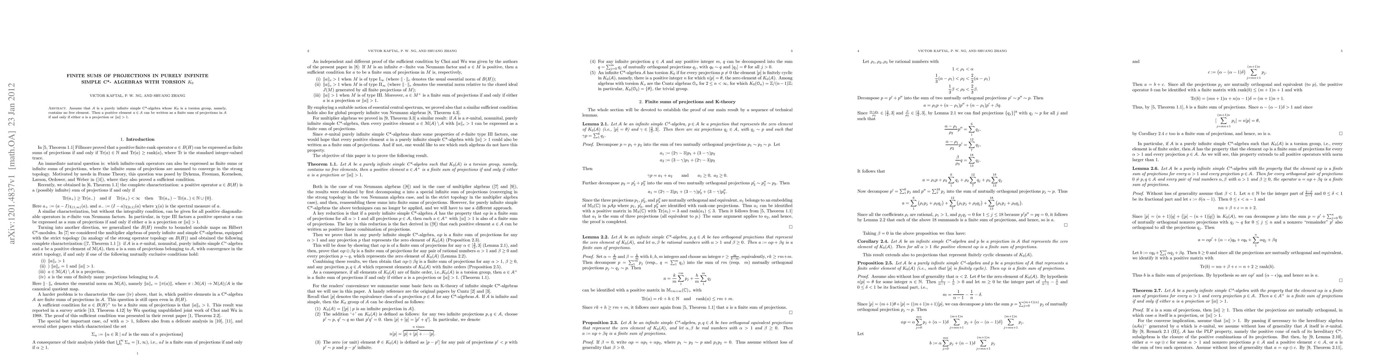 A purely infinite simple C*-algebra with a torsion K_0 group can only be represented as a finite sum of projections if the element is either a projection or has norm greater than 1.