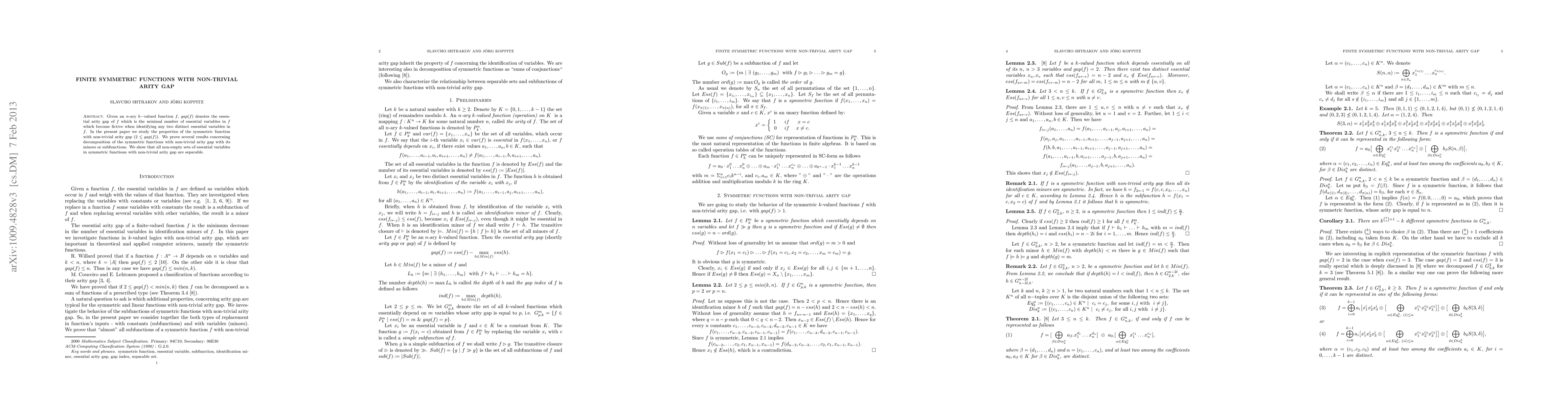 This paper investigates symmetric functions with non-trivial arity gaps, proving properties of their decomposition into minors or subfunctions. It demonstrates that all non-empty sets of essential variables in such functions are separable.