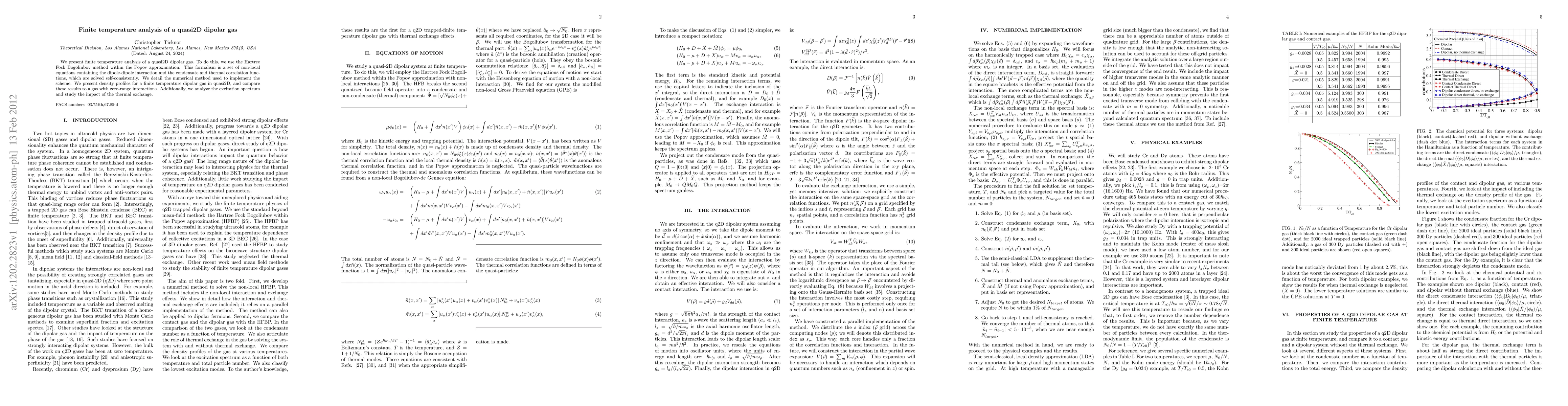 We present finite temperature analysis of a quasi2D dipolar gas. To do this, we use the Hartree Fock Bogoliubov method within the Popov approximation. This formalism is a set of non-local equations containing the dipole-dipole interaction and the condensate and thermal correlation functions, which are solved self-consistently. We detail the numerical method used to implement the scheme. We present density profiles for a finite temperature dipolar gas in quasi2D, and compare these results to a gas with zero-range interactions. Additionally, we analyze the excitation spectrum and study the impact of the thermal exchange.